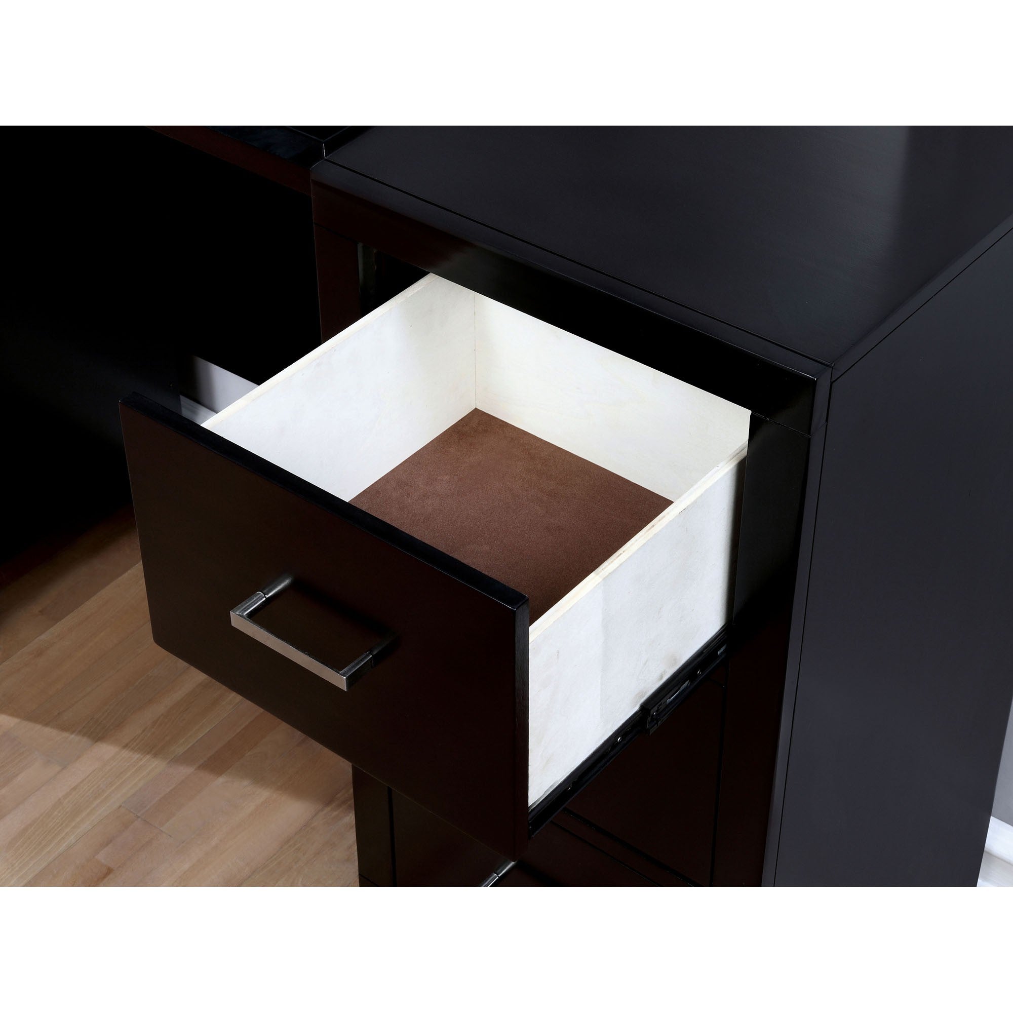 A little self-indulgence is appropriate. Our best selling bedroom set now comes with its own matching vanity desk! Finished in espresso, it's versatile and a great addition to any contemporary master suite.