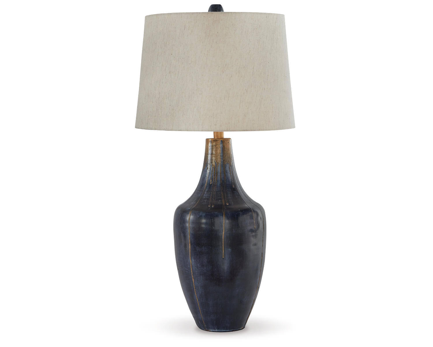 Distressed indigo and gold finished metal table lamp. Modified drum hardback shade. 3-way switch. (1) E26 socket, type A bulb recommended - 100 watts max or 23 watts max CFL. Due to the hand crafted nature of this product, some variations may occur.