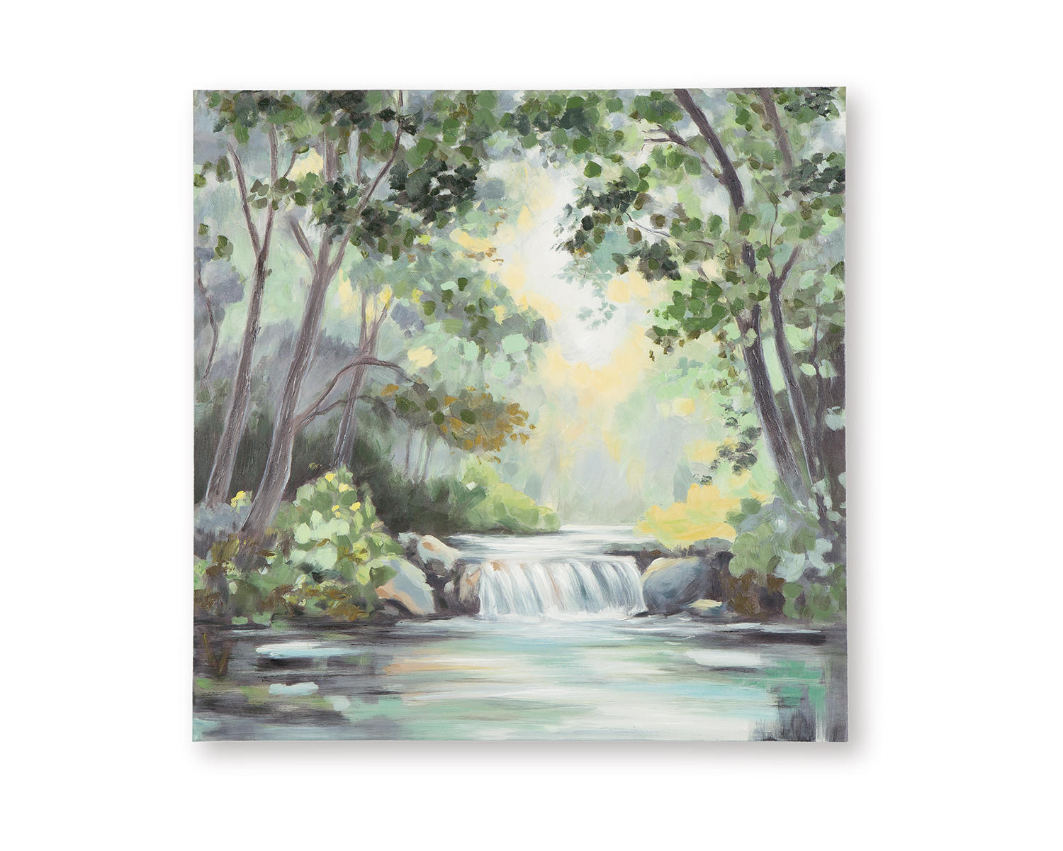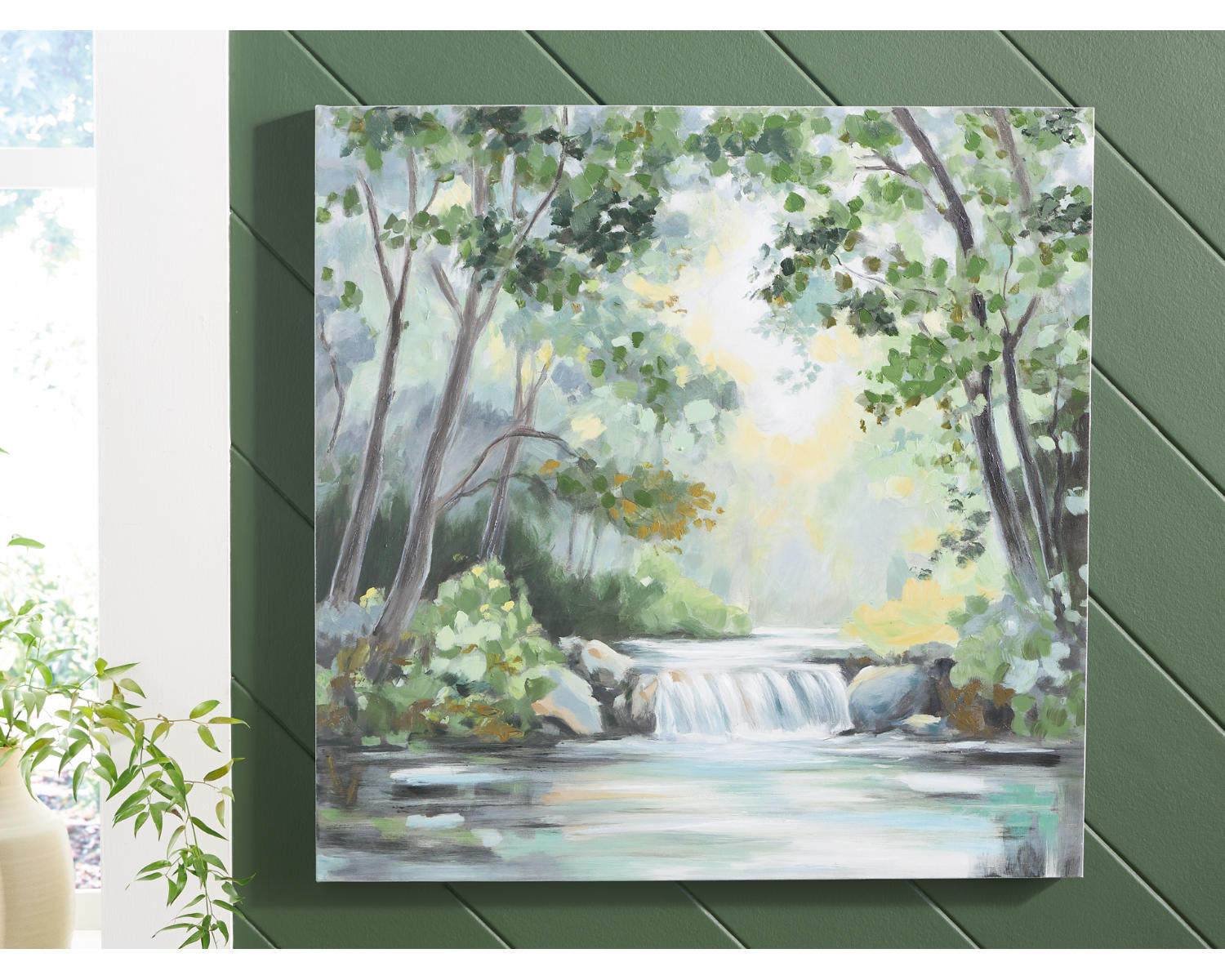 Hear the babble of water and a breeze in the trees when you glance at this wall art. It captures a picture-perfect moment in time, ushering the peaceful vibe of nature into your home. The hand-painted landscape is sure to make an impression in your living room or office.
