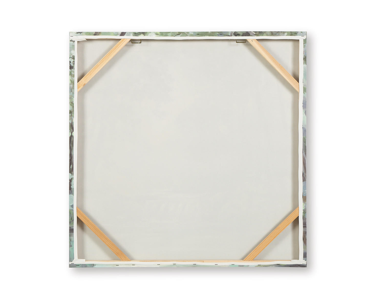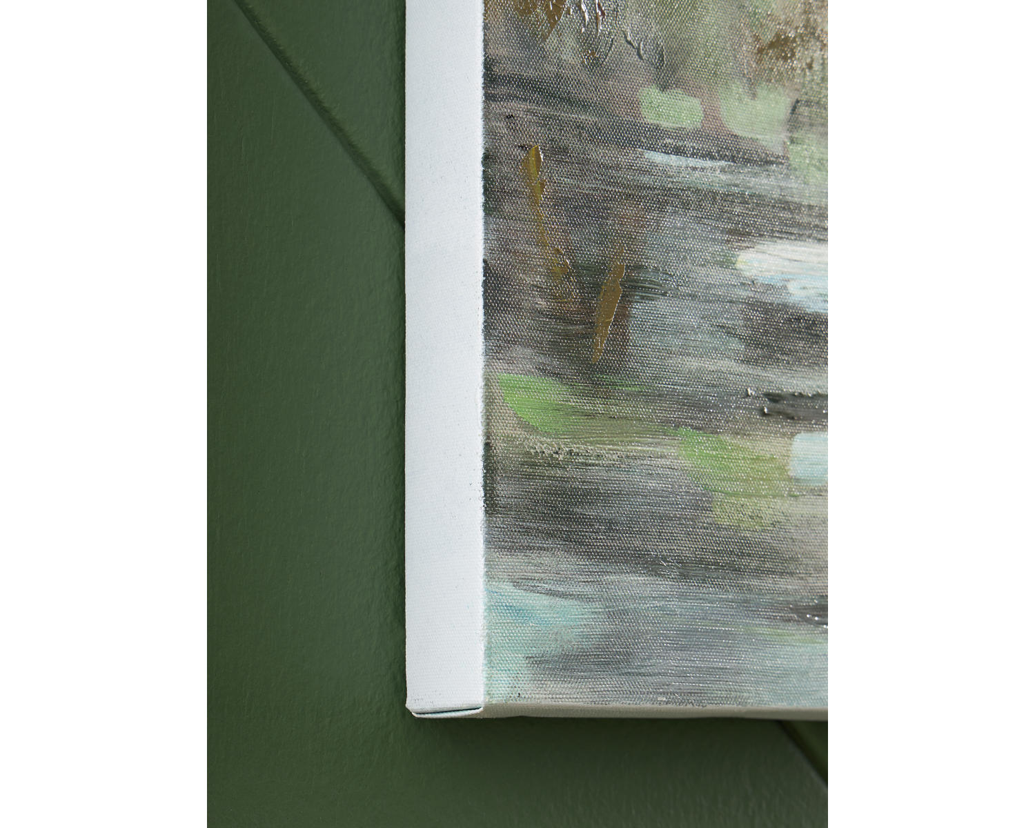 Landscape design in shades of green, gray, yellow and white. Gallery wrapped canvas. Hand painted. Sawtooth bracket for hanging. Due to the hand crafted nature of this product, some variations may occur.