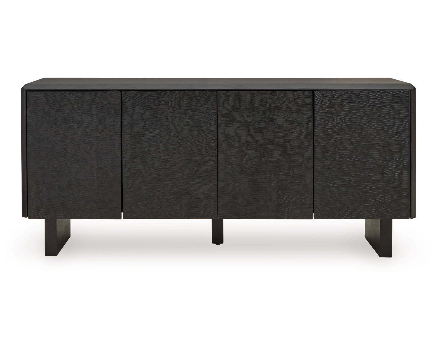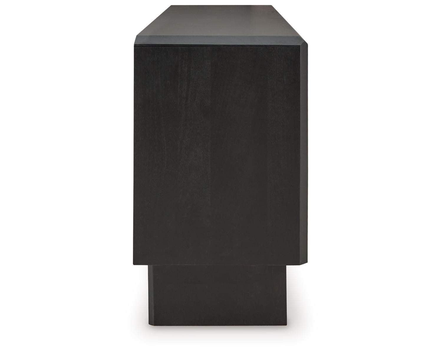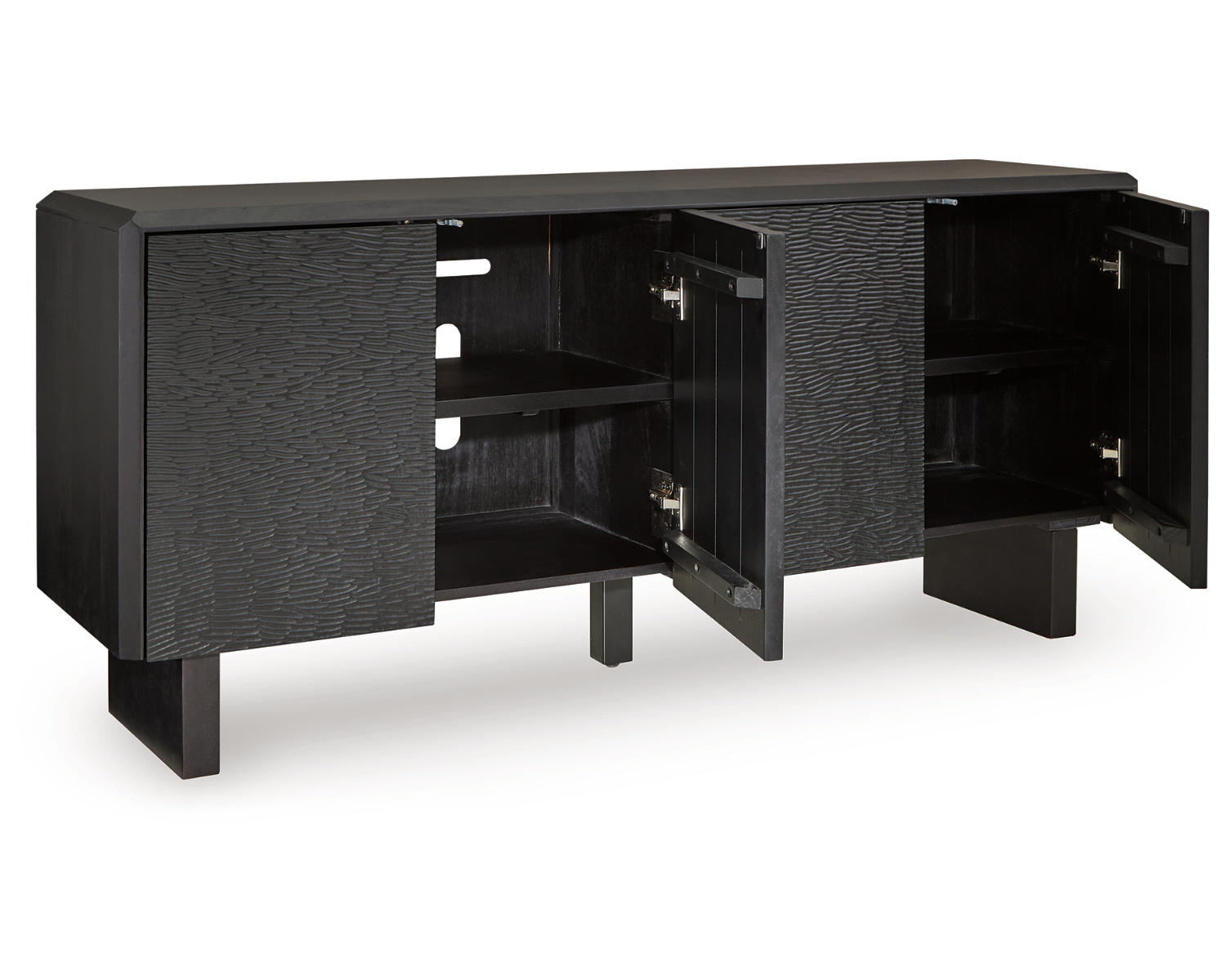 Function and style merge perfectly with this accent cabinet. Crafted of solid wood in a black finish, this piece makes a great case for fresh contemporary design. Doors with a carved pattern open to reveal shelving, while beveled edges add a distinctive touch. Whether you use it for storage or as a TV stand, your love of unique style will shine front and center.