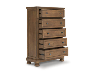 Casual traditional styling. Made with Pine solids and veneer with MDF substrate. Finished in a chestnut brown wood tone. Case designs feature casual traditional styling for a timeless retreat. Framed inset drawers feature fully finished interiors, English dovetail construction and heavy duty ball-bearing side glides. Top drawers have black felt bottoms. Round metal knobs finished in an aged pewter color. Special features include a concealed jewelry tray in the upper center drawer of the dresser, and an additional hidden tray in the nightstand for other valuable items. Both the sleigh headboards (77/78) or panel headboards (57/58) can use either storage footboards (74/98 and 76/99) and panel footboards (54/96 and 56/97).