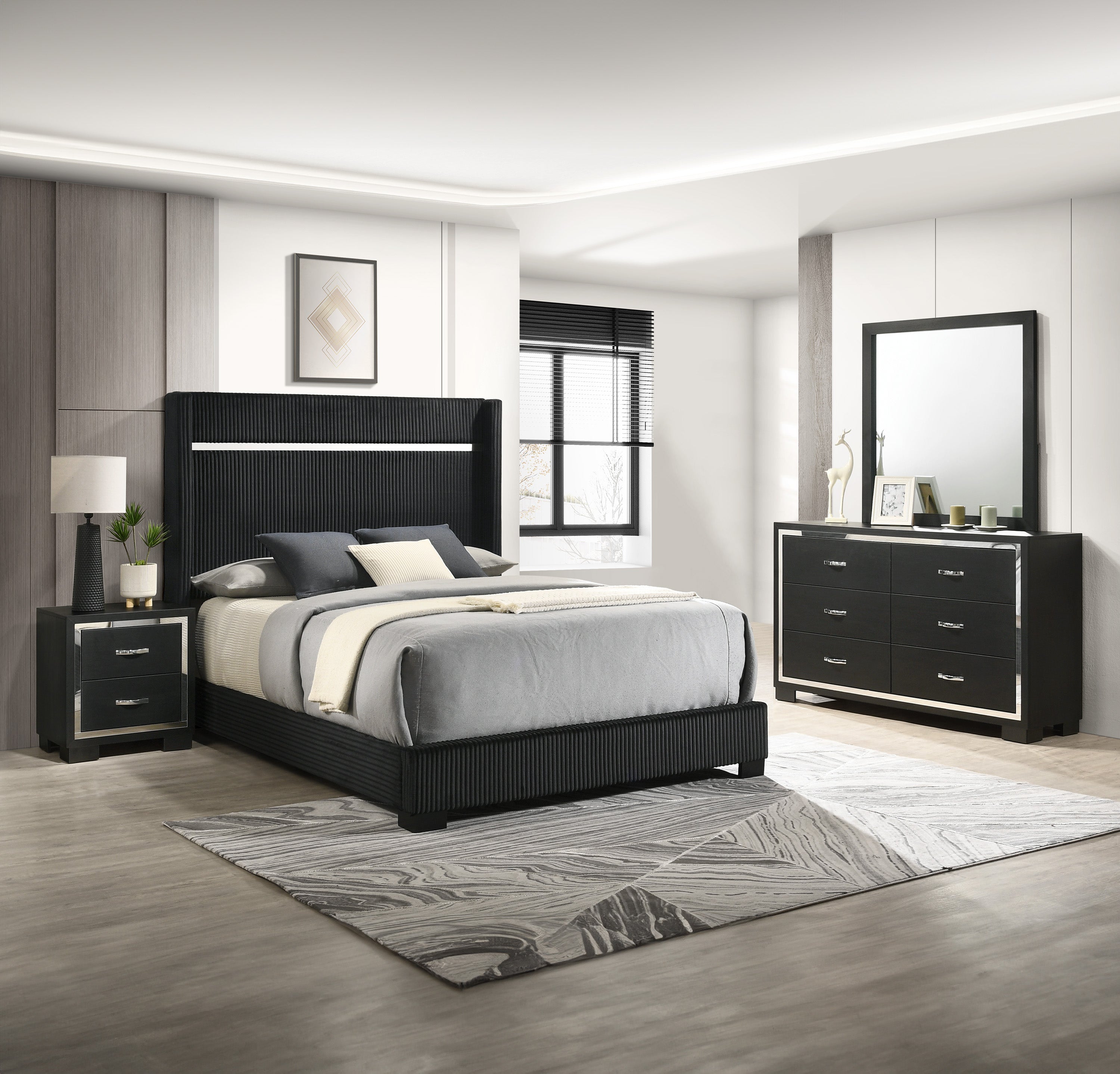 This bedroom collection strikes a balance between bold and classic styles. It features a striking bed with a high, textured headboard that commands attention. The accompanying case goods, including a dresser with a mirror, chest, and nightstand, are all finished in a sharp, black hue that adds depth and modernity to any bedroom. Each piece is accented with sleek metal handles that contrast beautifully against the dark finish. The clean lines and uncluttered design of the furniture allow for versatile placement in a variety of interior styles, from contemporary to transitional.