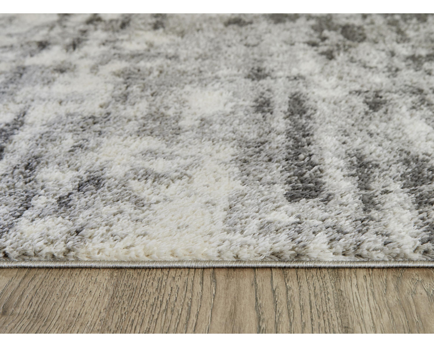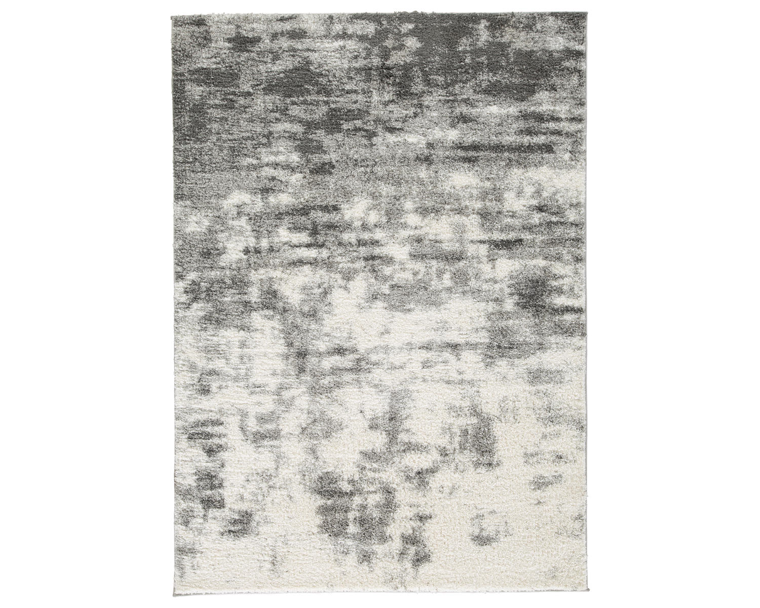 Machine woven abstract design shag in cream, gray, and charcoal. Polyester. 30mm pile. Backed with jute. Spot clean only. Rug pad recommended.