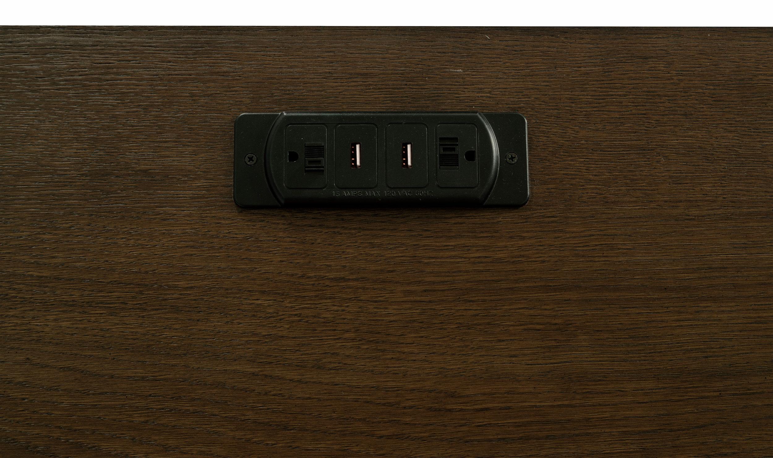 Get creative in how you use and style this attractive Credenza. Its warm burnished oak finish enhances its frame while supported on bracket style legs. Plenty of storage is found within its felt-lined top drawers. Removable dividers allow for extra organization with this piece. Keep your valuables safe and sound within the two lower cabinets that lock with an included key.