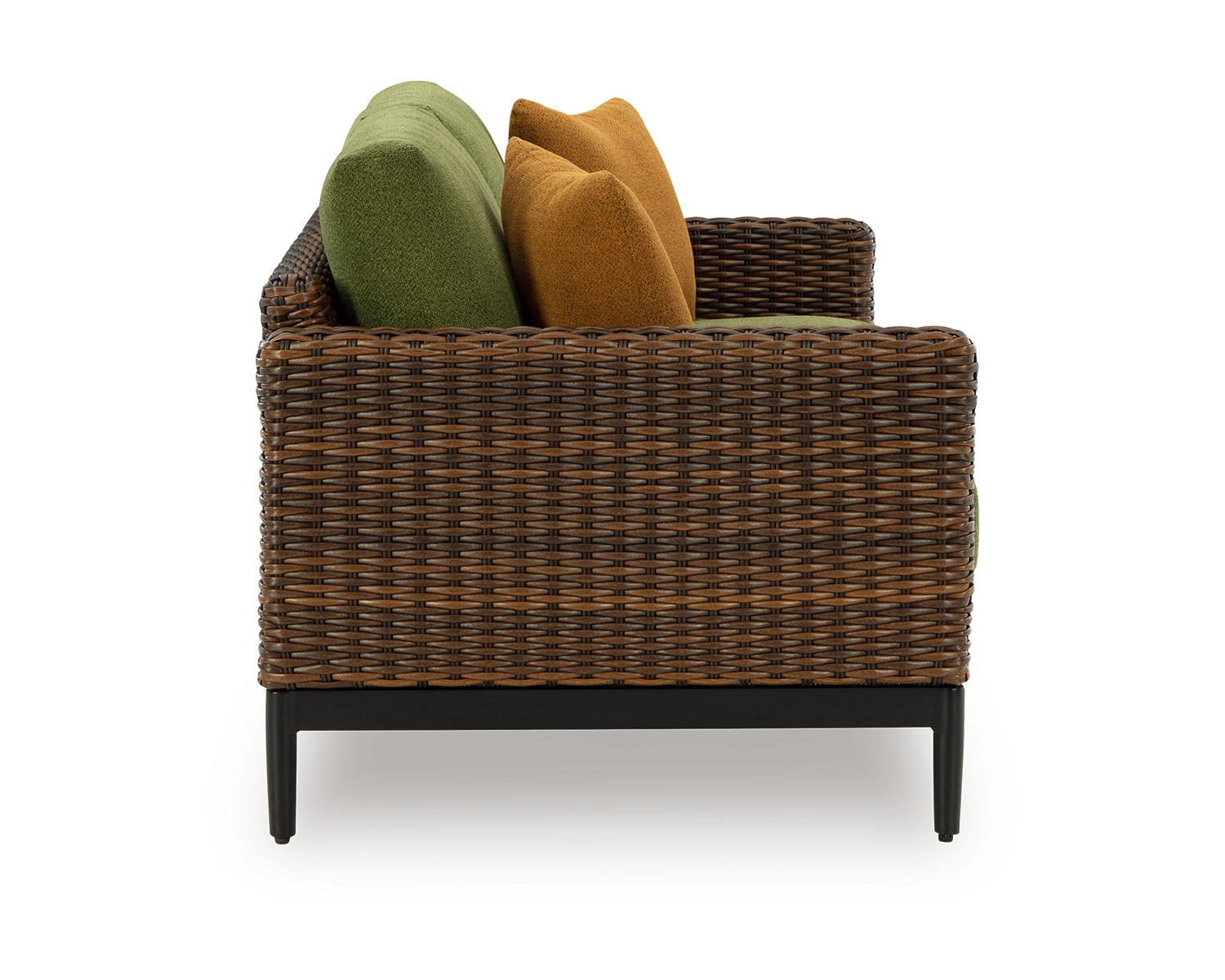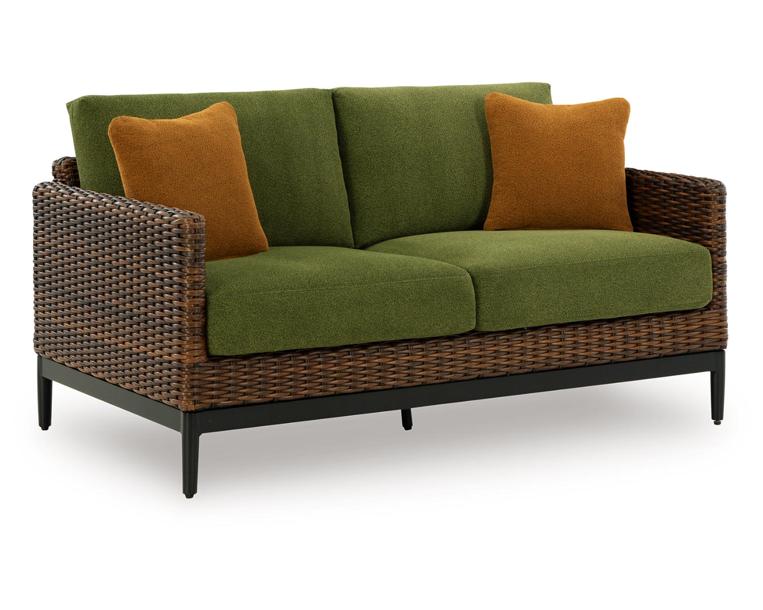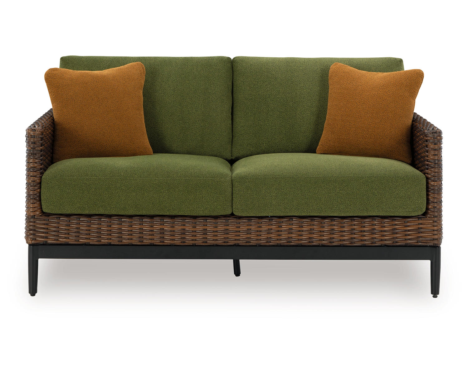 Millennium Collection. Wood-look aluminum tables. Nuvella+ high performance green fabric. Assembly required. Loveseat includes two throw pillows and sofa includes four throw pillows.