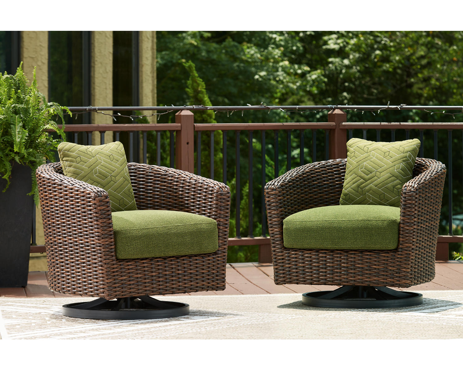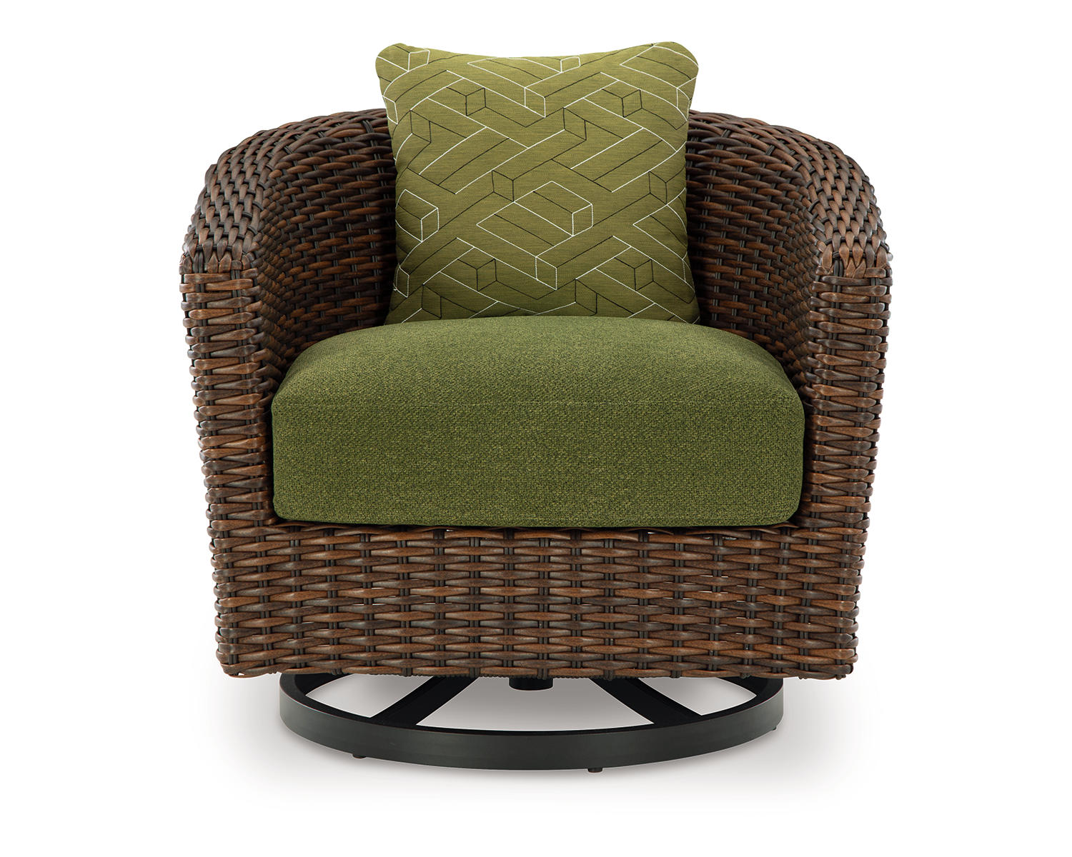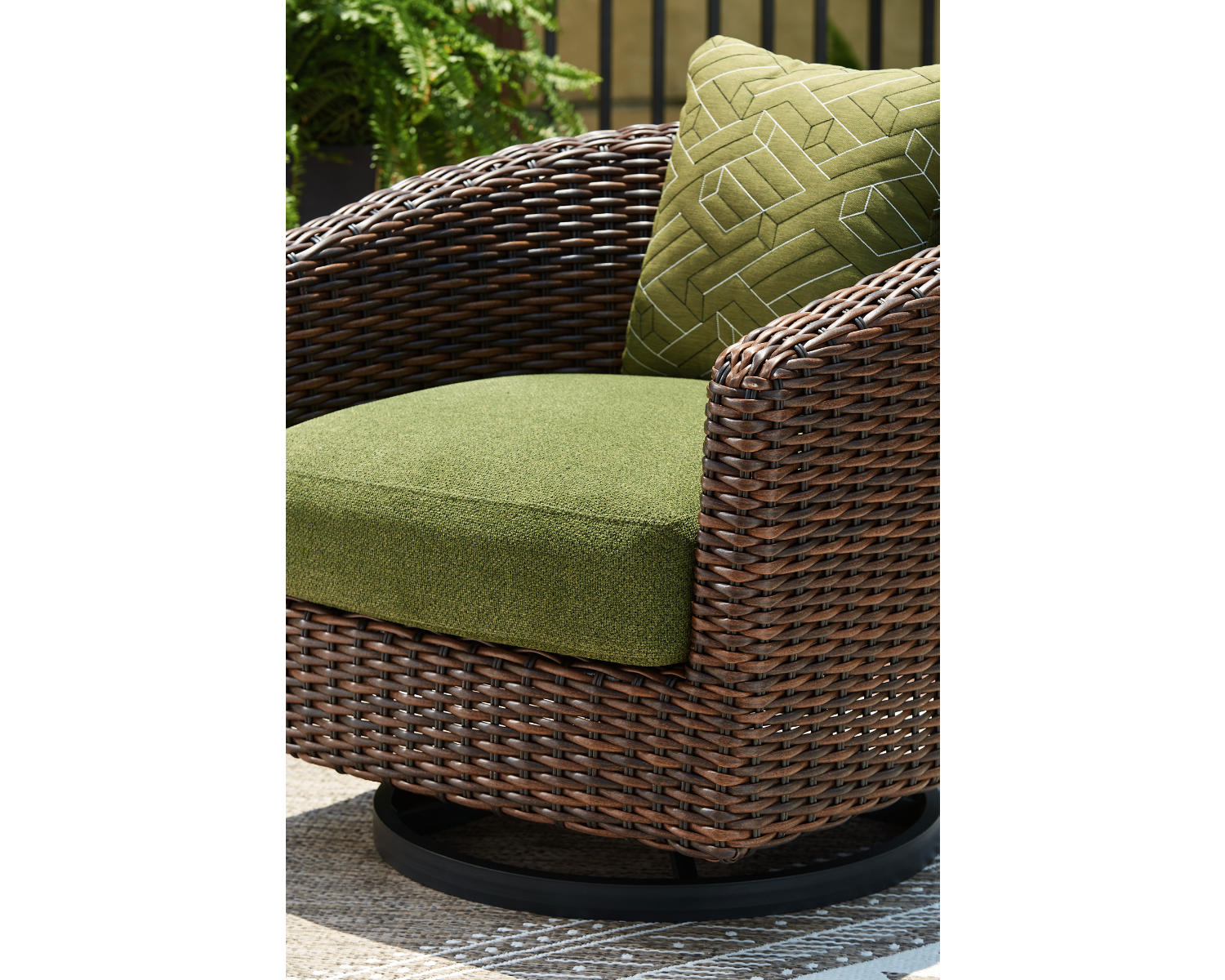 This outdoor swivel lounge chair recalls the aesthetics of nature to bring an inviting, high-style feel to your patio or lanai. Its Nuvella+™ performance fabric is made with enhanced UV resistance, so the chic green hue stays brighter for longer. Worried about the weather? Don't sweat it—the durable resin wicker withstands the elements from season to season.
