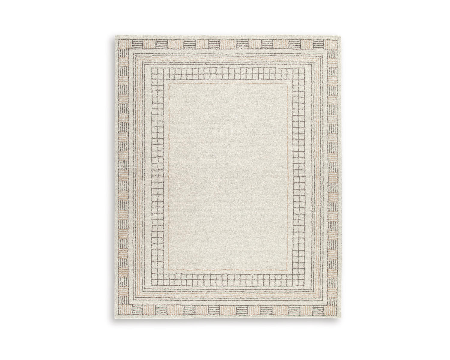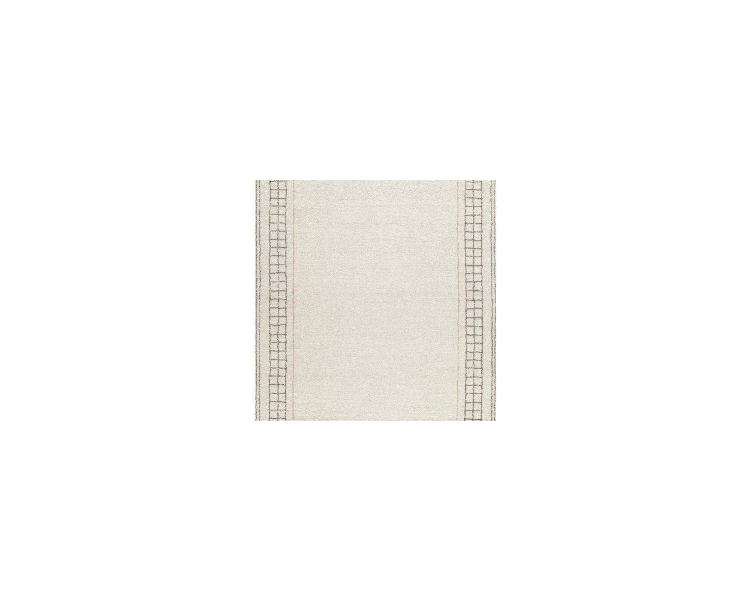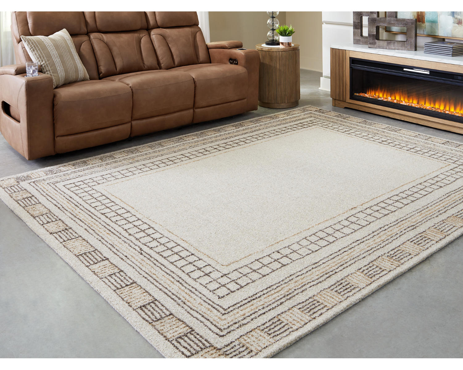 Hand tufted, border design in taupe, brown and jute. 10mm pile. Wool/jute blend, backed with cotton. Spot clean only. Rug pad recommended.
