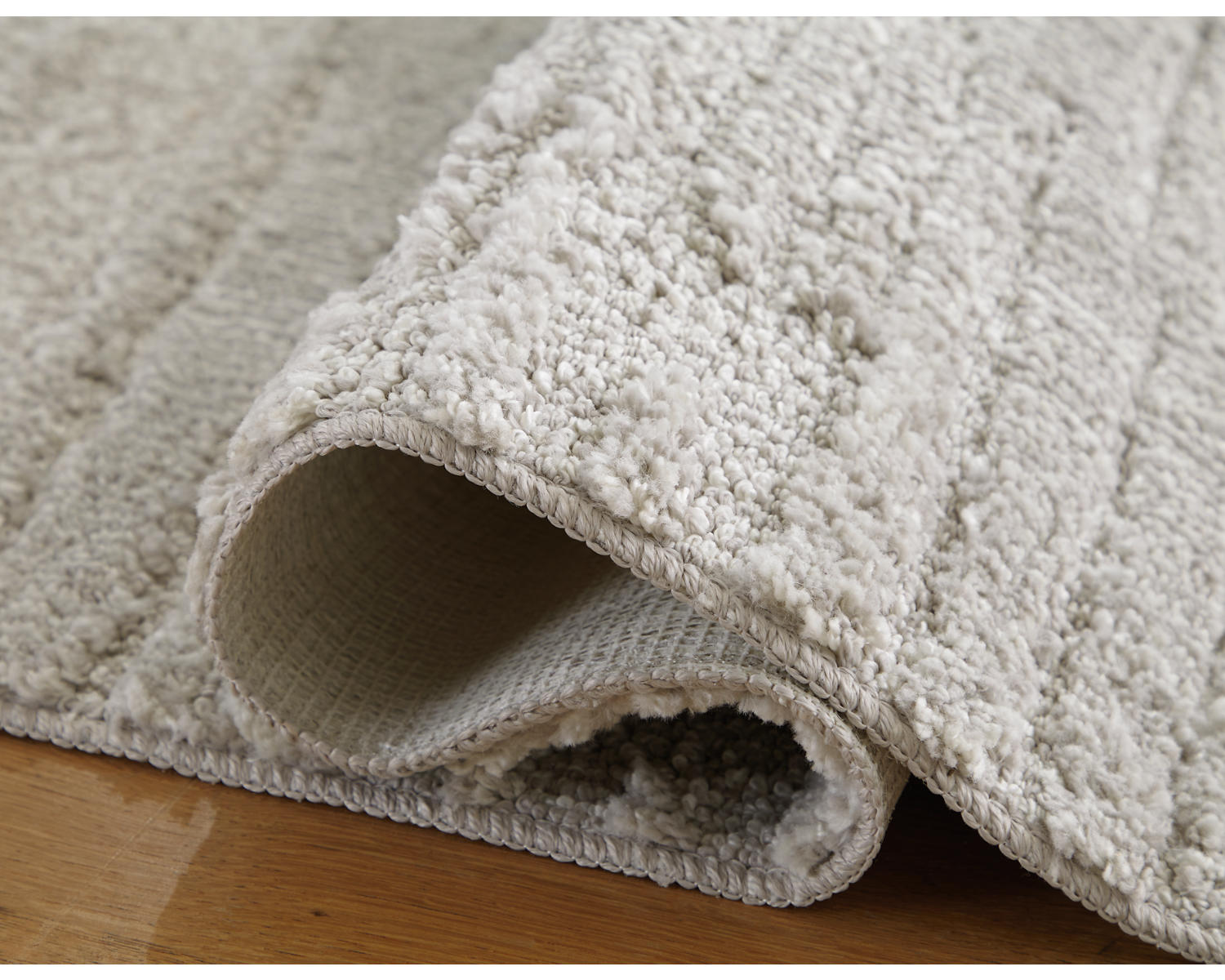 Machine tufted high-low, abstract linear design in gray and ivory. 19mm pile. Polypropylene, backed with latex. Spot clean only. Rug pad recommended.