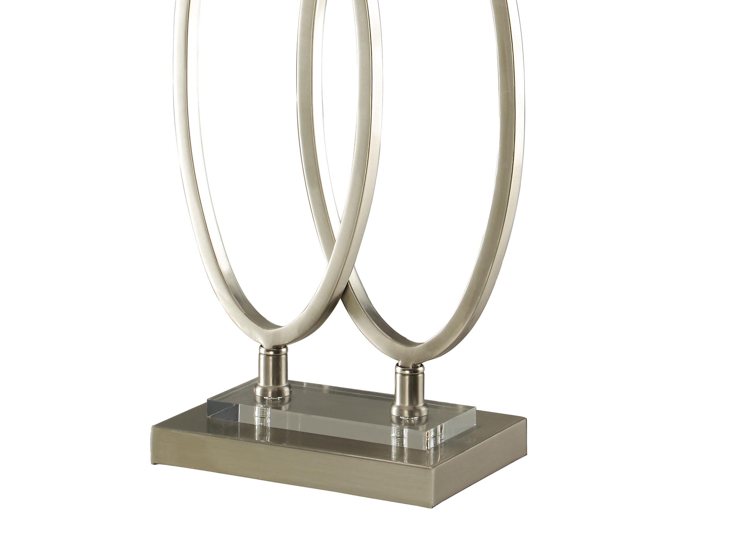 This modern table lamp features a pair of brushed nickel oval rings that float within a crystal-clear base, bringing sculptural balance to any space. Its rectangular fabric shade adds contrast and definition, while the sleek silhouette complements a wide range of contemporary or transitional interiors. Designed for both style and function, this striking accent lamp elevates your living room, bedroom, or home office with a polished presence.