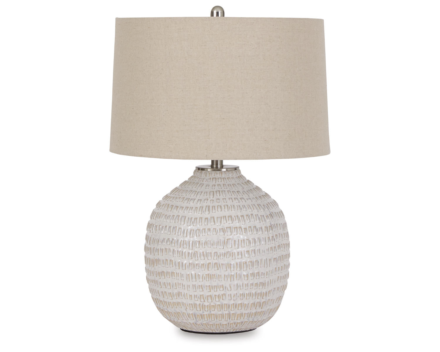 Style and function come together in this textured ceramic lamp to bring incandescent style to any space in your home. Combining a rounded base, accented with goldtone hardware, this lamp is capped off with a simple natural lampshade for complete elegance. Pair with a wide variety of furniture styles for a versatile indoor lighting option you'll love.