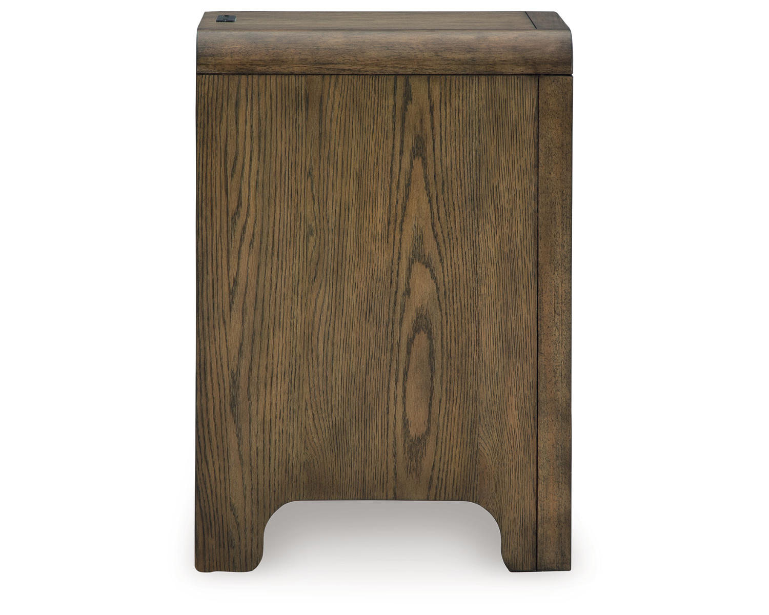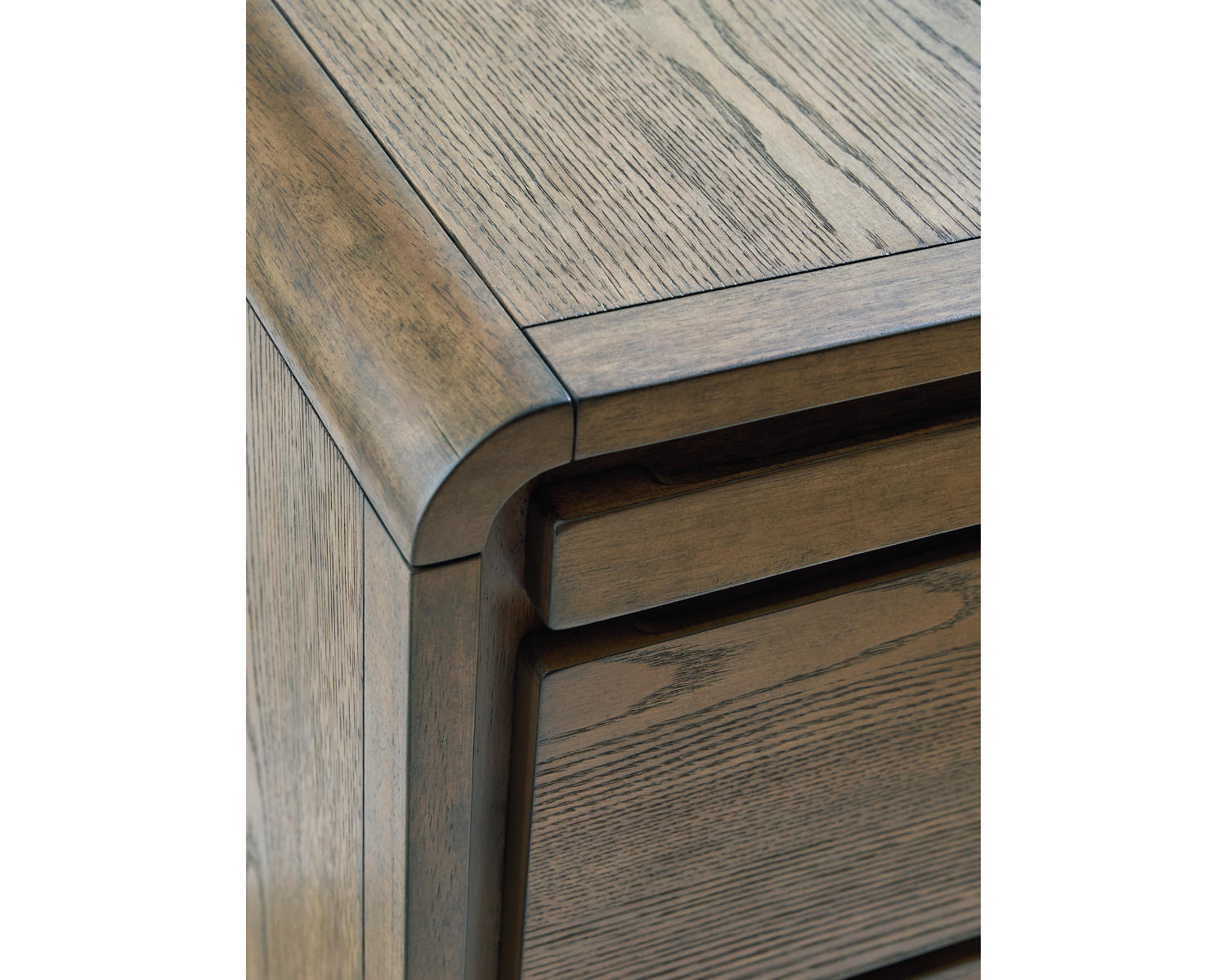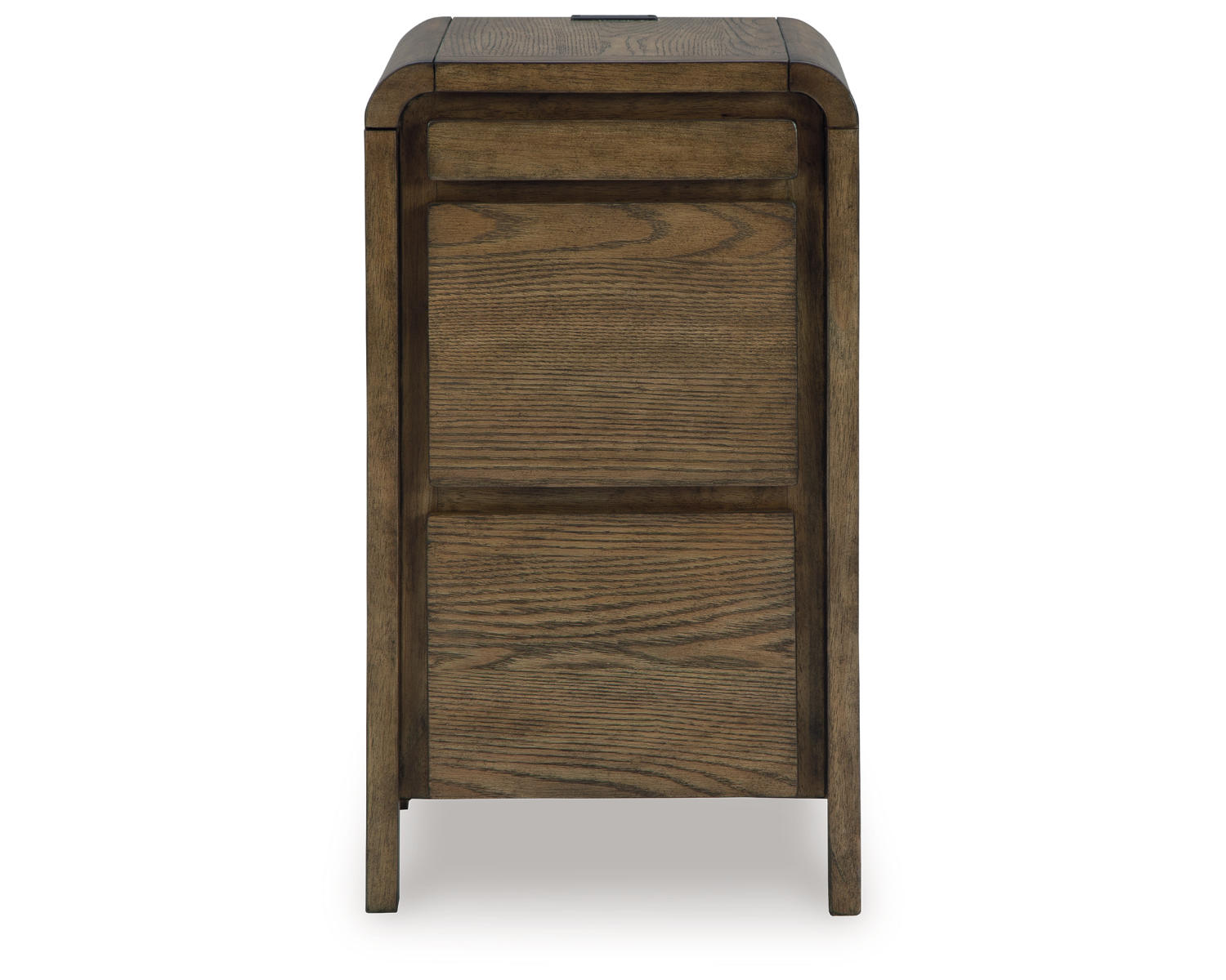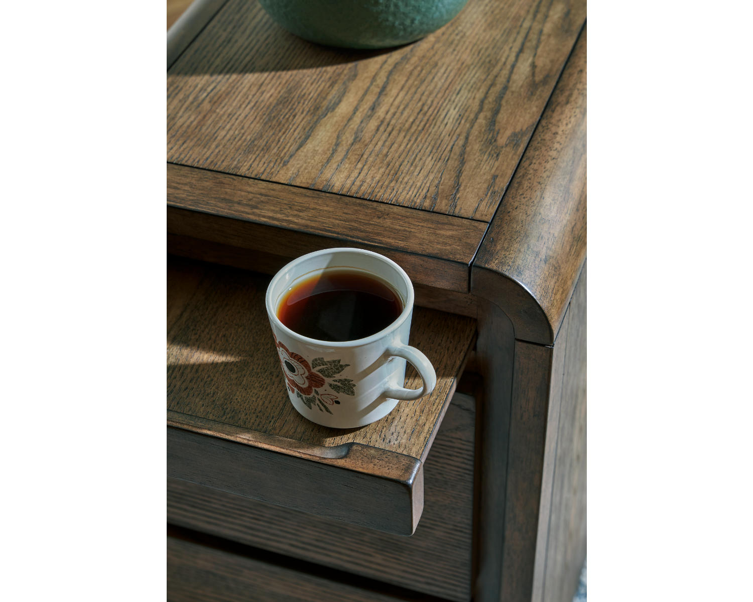 Accent table. Constructed of solid, veneer and engineered wood in a warm brown finish. 2 drawer and 1 pull-out tray. USB and USB-C charging port. Curved edge details.