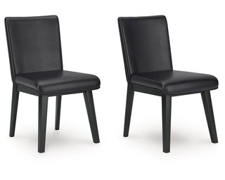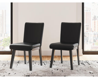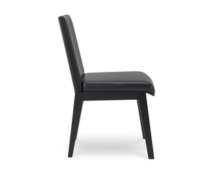 This set of 2 dining chairs exudes modern sophistication. Finished in a sleek black wood-tone with black faux leather upholstery for added comfort and style, it brings a beautifully balanced look to the table. A simply striking feast for the eyes—now your only worry is who to invite for dinner.
