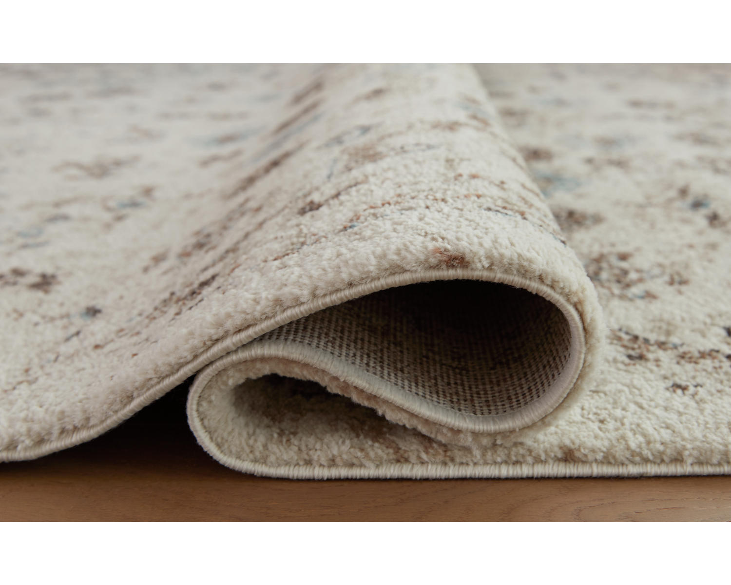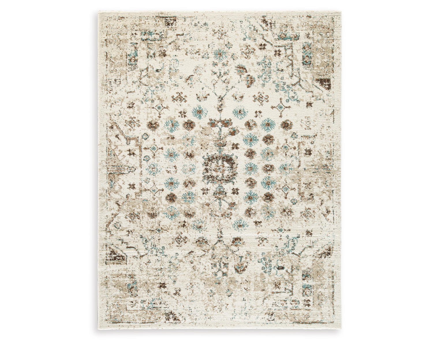 Machine woven, medallion design in shades of ivory, brown, and teal. 12mm pile. Polypropylene. Spot clean only. Rug pad recommended.