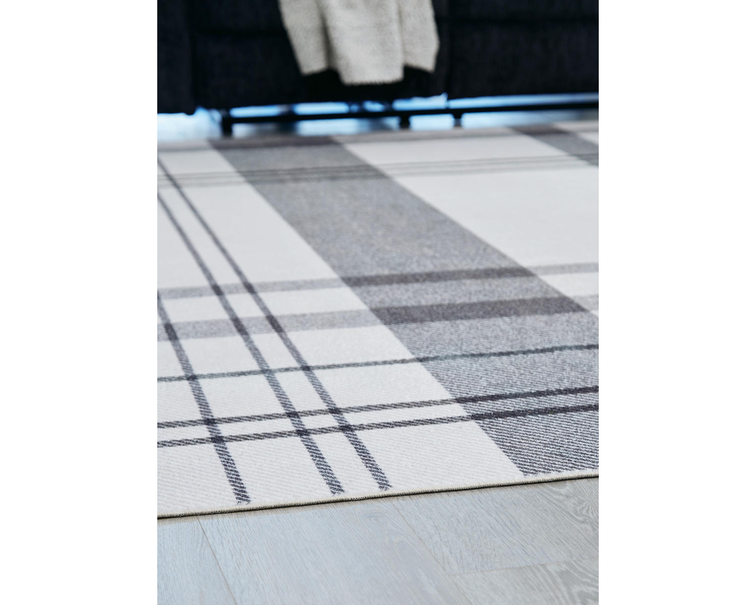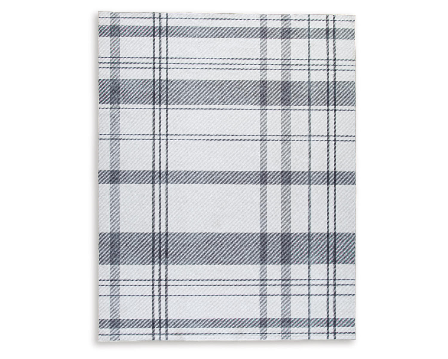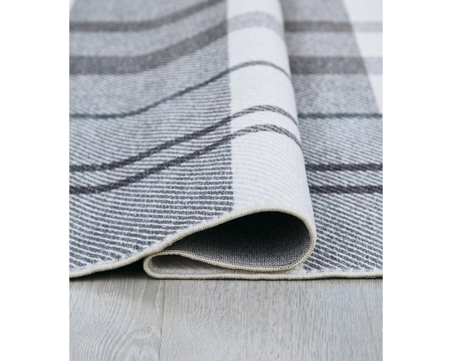 Machine woven, printed plaid design in cream and shades of gray. 3mm pile. Polyester velvet, backed with TPR/canvas blend. Machine washable and foldable. Rug pad recommended.