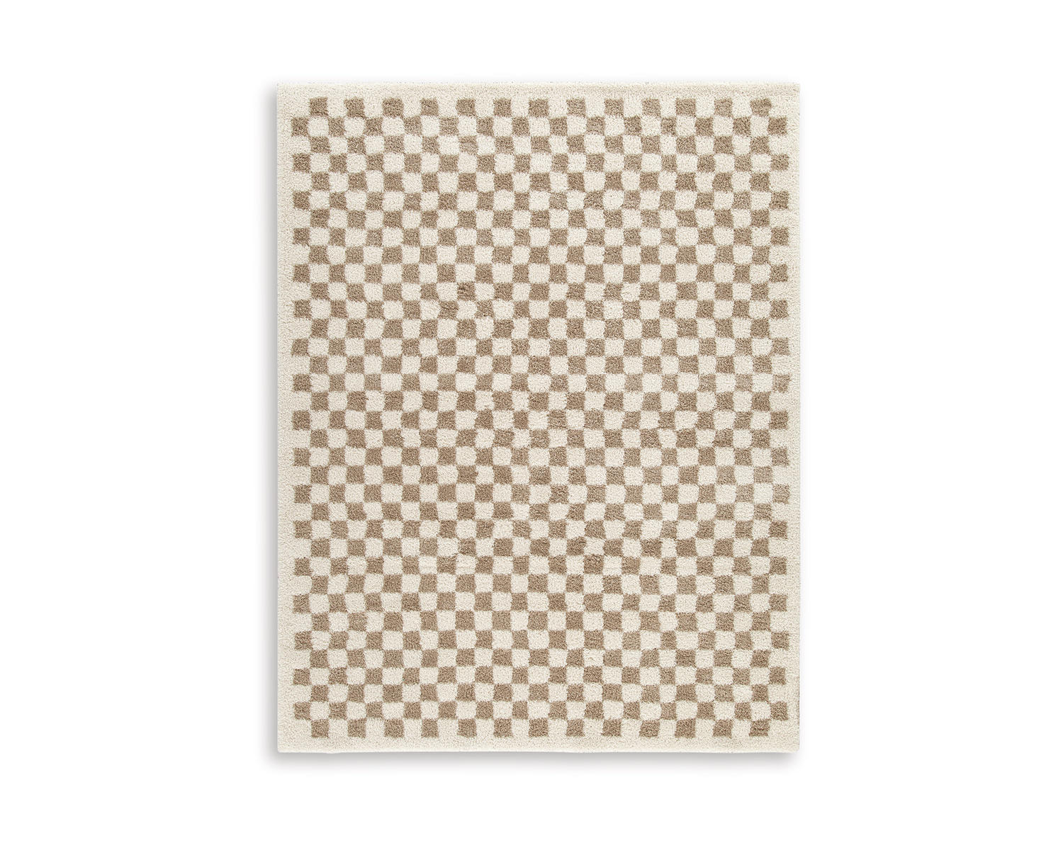 Machine woven shag, checkered design in taupe and ivory. 30mm pile. Polypropylene. Spot clean only. Rug pad recommended.