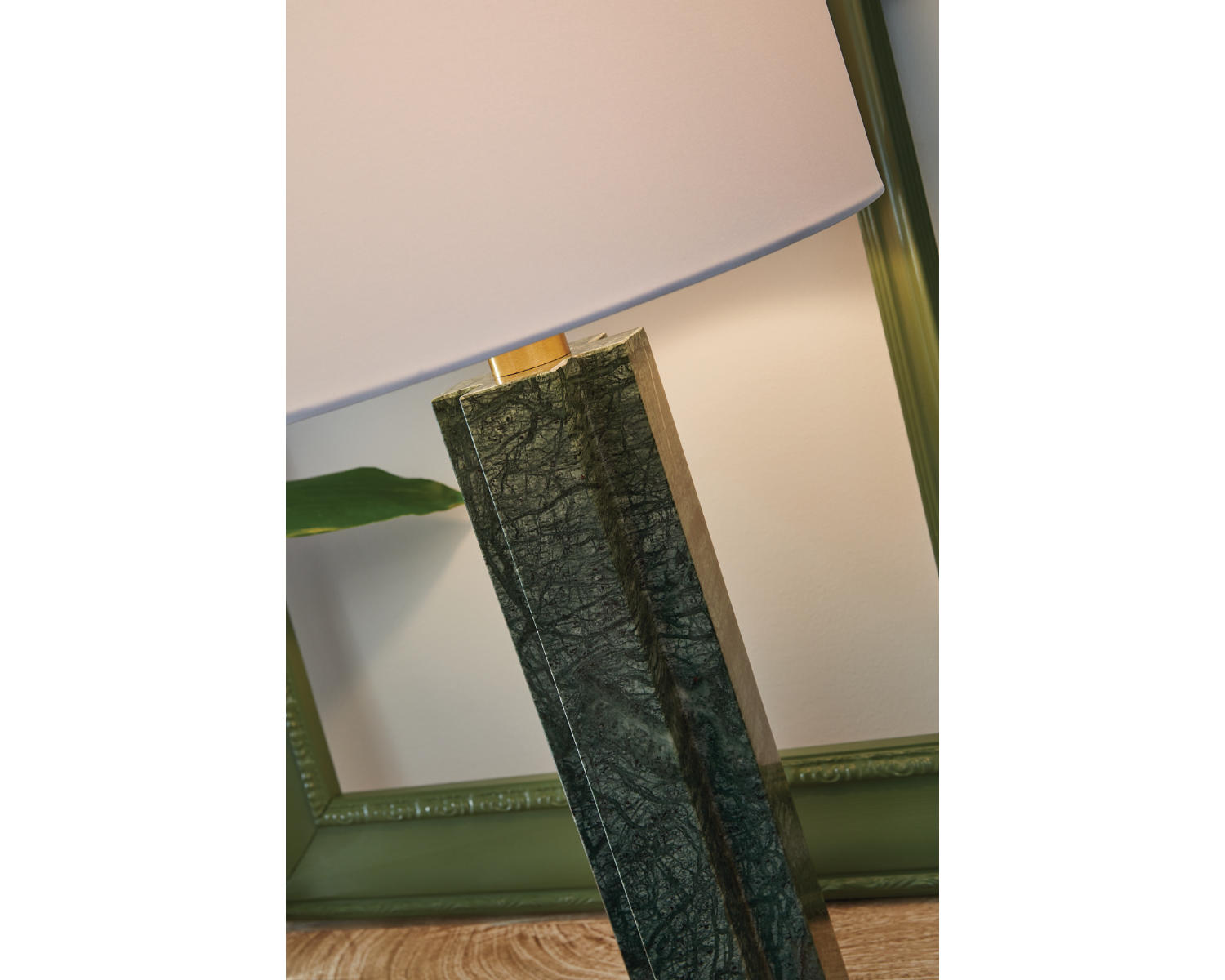 This table lamp is a master class in understated sophistication. Its sleekly dimensional base, crafted from rich green marble with subtle goldtone metal accents, adds a quietly exquisite touch to your favorite space. The statement-making lamp is a welcome addition wherever refined taste reigns supreme.