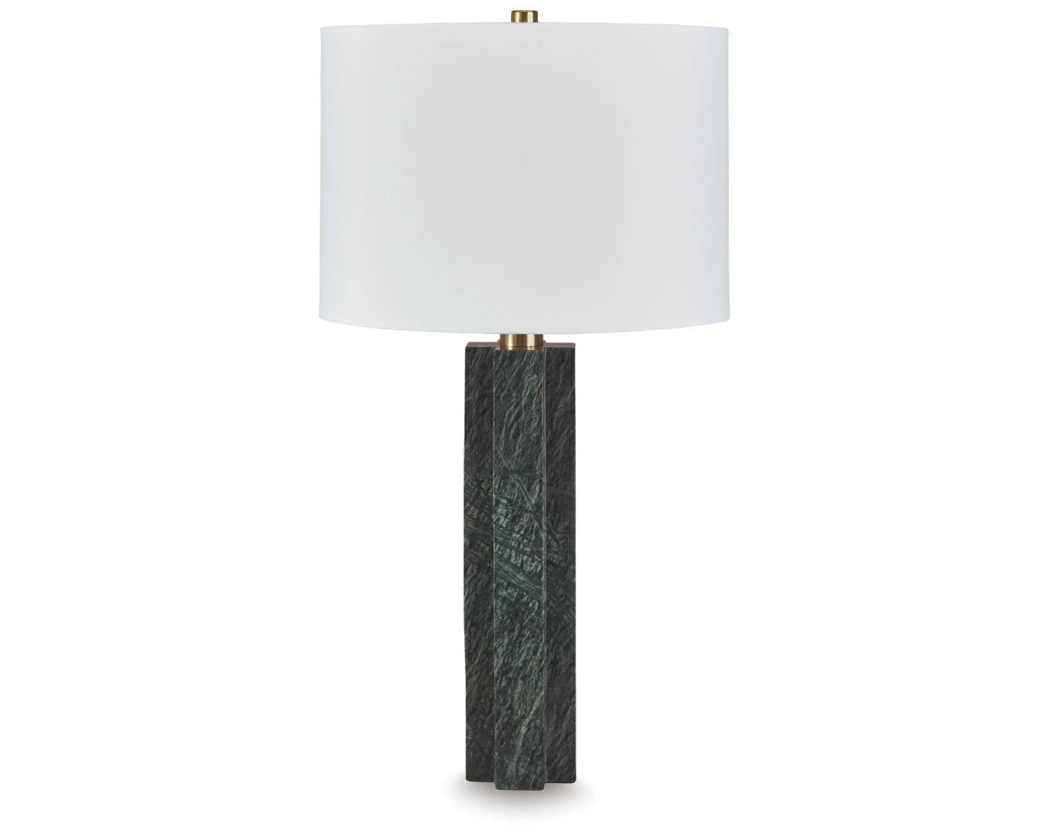 Green marble and gold finished metal table lamp. Drum hardback shade. 3-way switch. (1) E26 socket, type A bulb recommended - 100 watts max. Due do the use of natural materials, some variations may occur.
