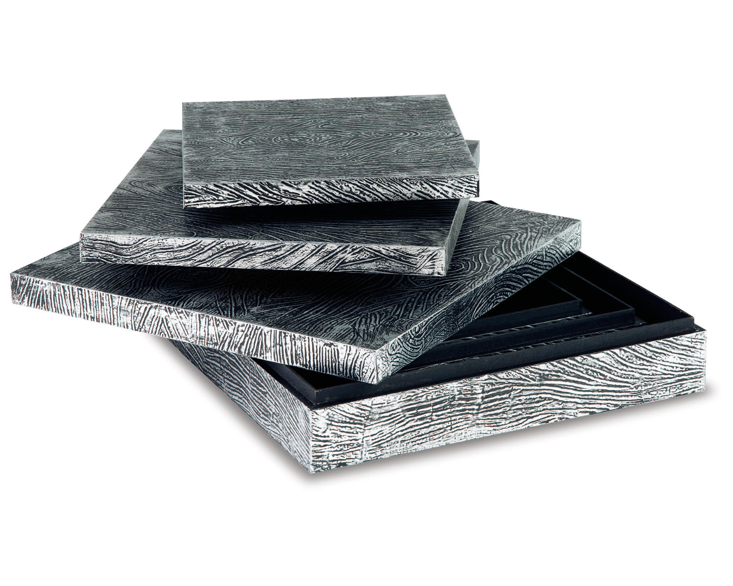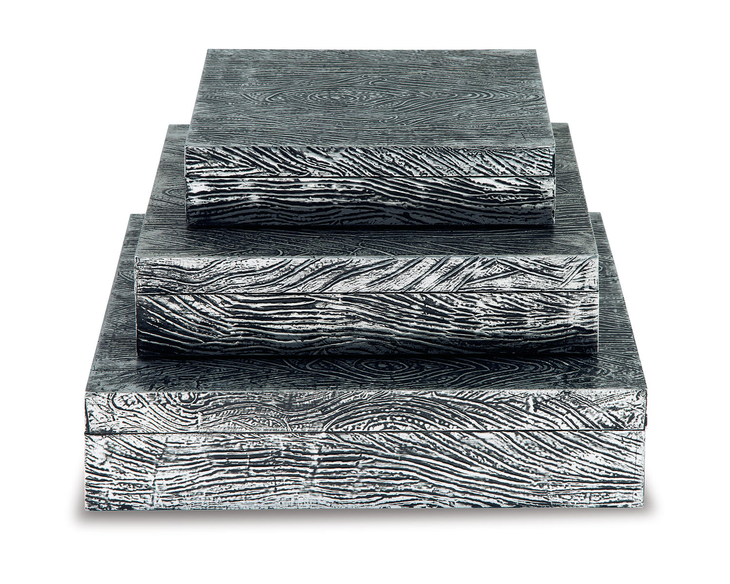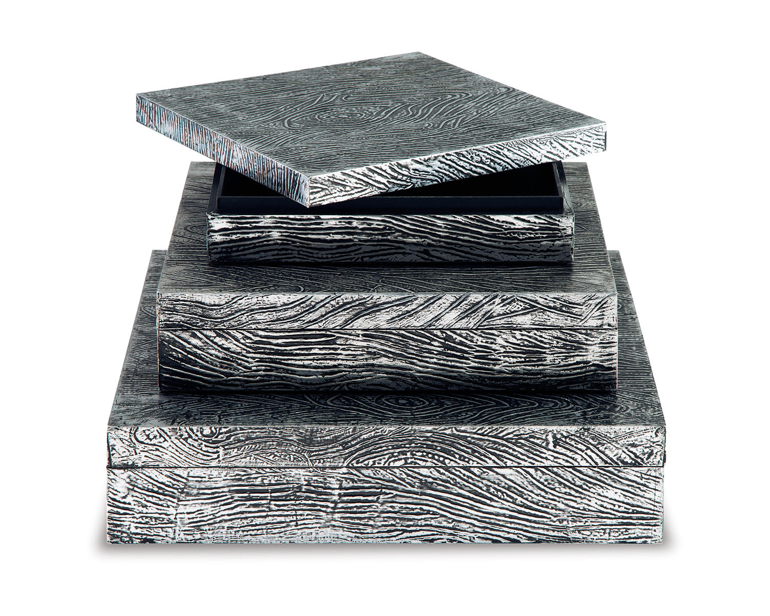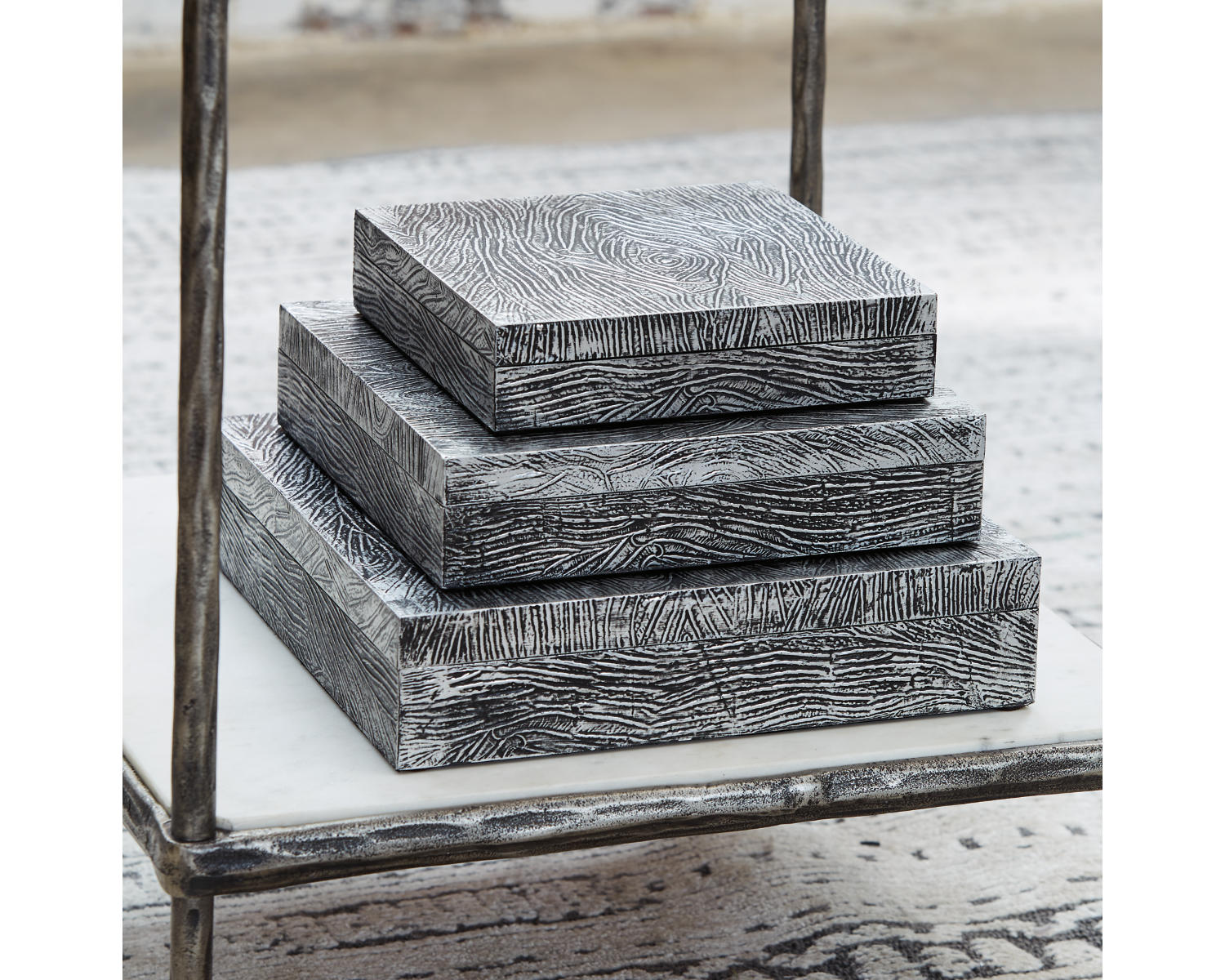 Ideal for a dresser, chest or accent table, this set of three wood and metal boxes is a contemporary choice for the forward-thinking modernist. The antiqued pewter-tone finish is an inspired touch.