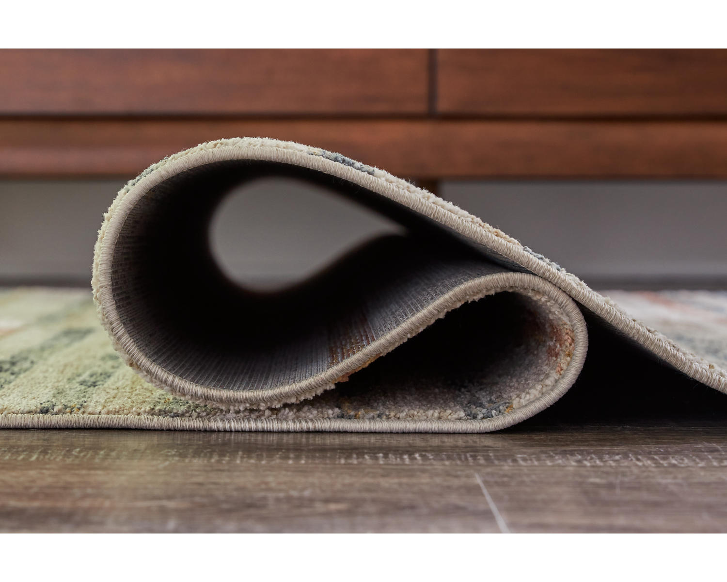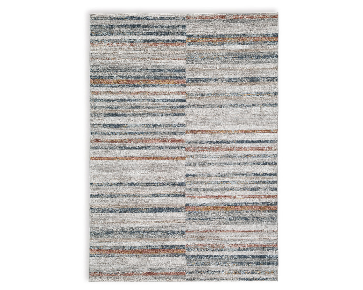 Machine woven, stripe design in shades of beige, gray, blue, gold and amber. 8mm pile. Polyester, backed with cotton. Spot clean only. Rug pad recommended.