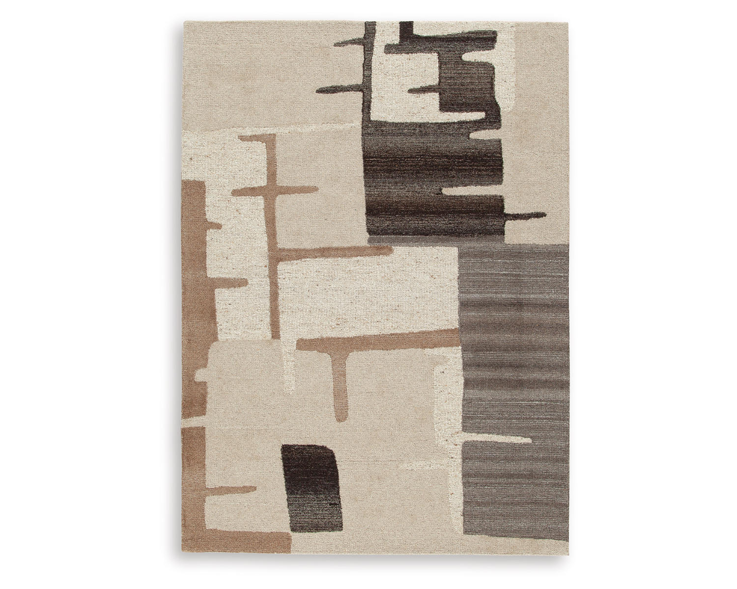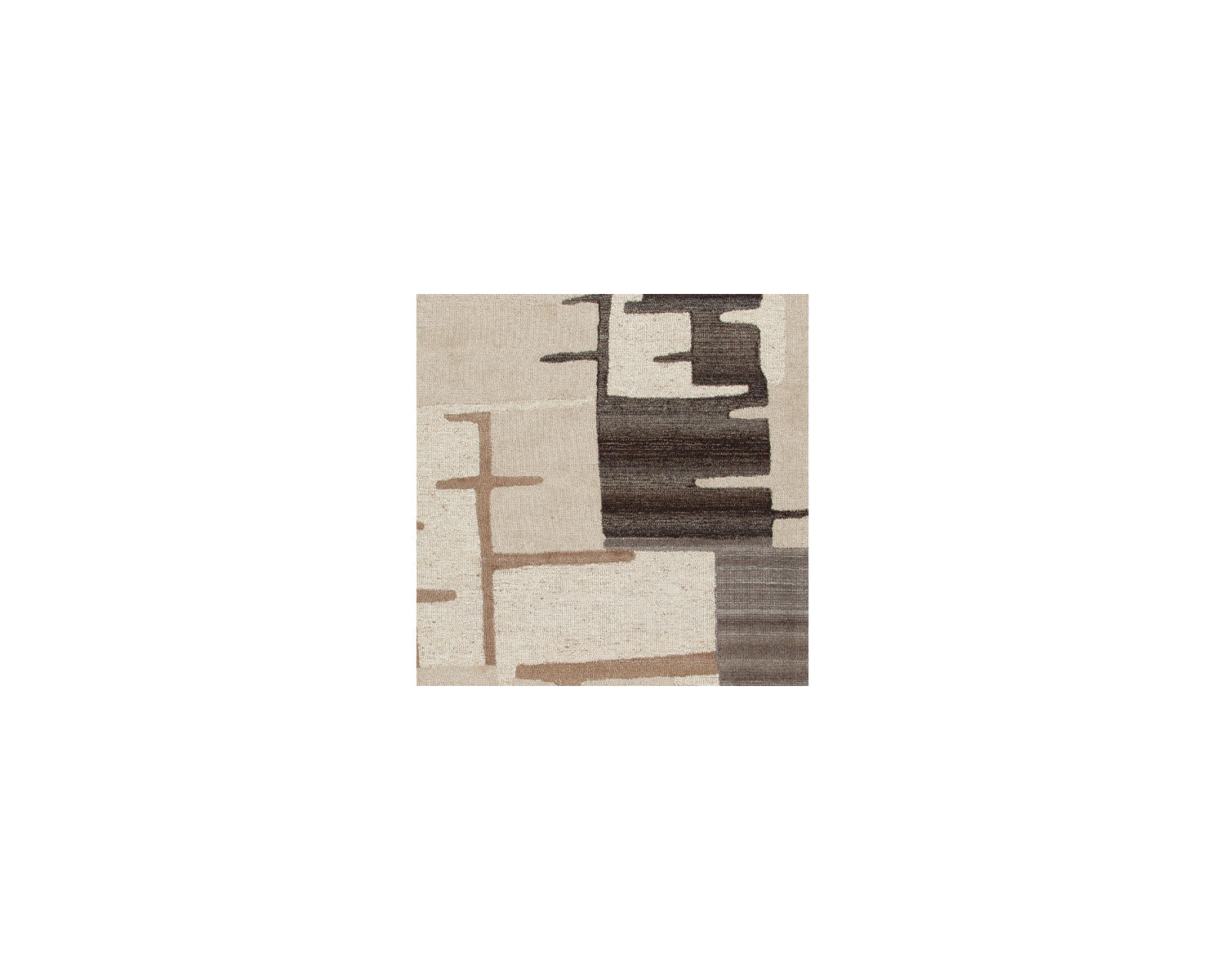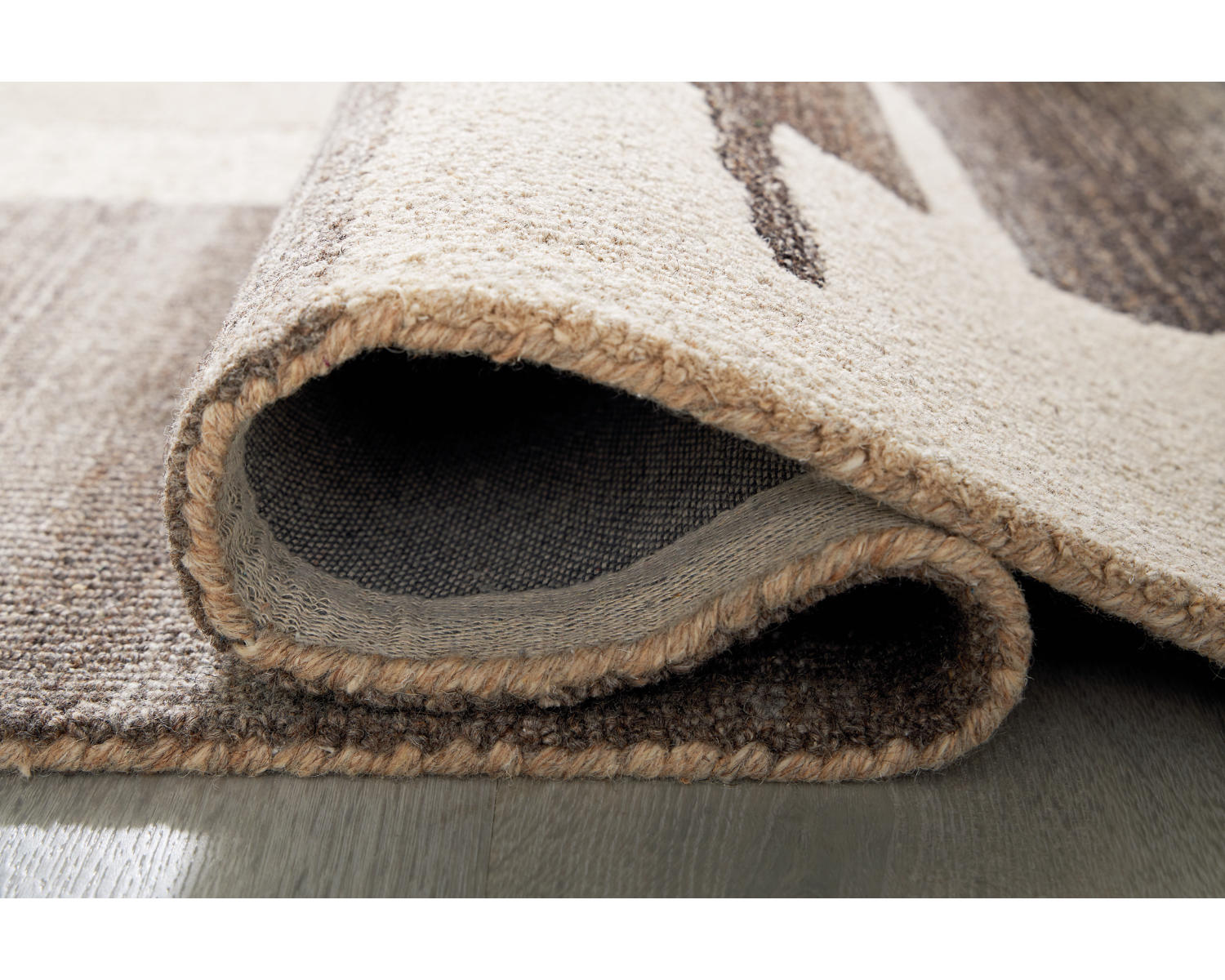 Hand tufted, abstract design in shades of tan, brown and black. 7mm pile. Wool/polyester blend, backed with cotton. Spot clean only. Rug pad recommended. Due to the handcrafted nature of this product, some variation may occur.