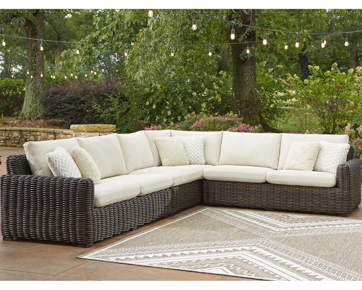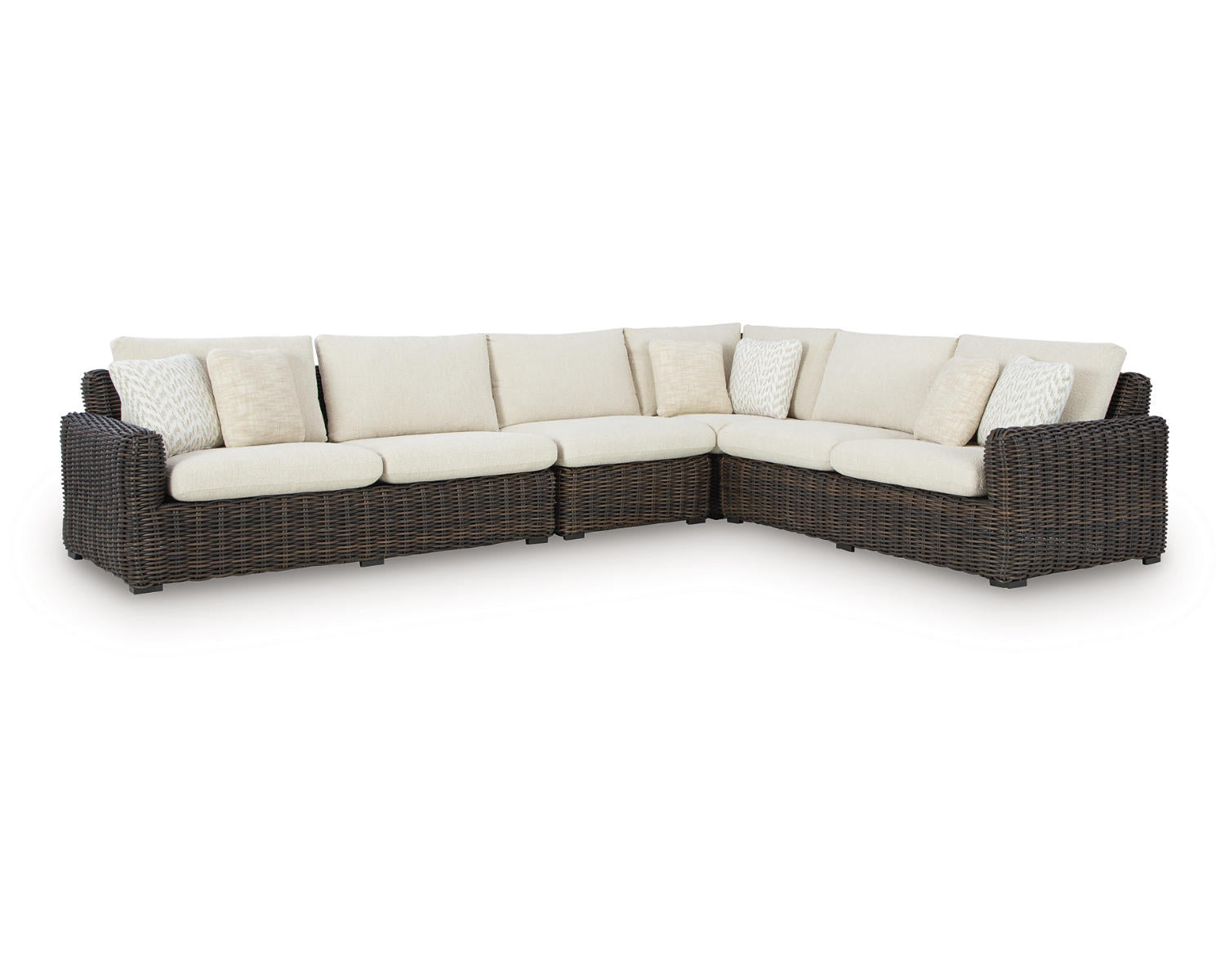Add luxury, comfort and durability to alfresco fun. This outdoor sectional captures the textural beauty of wicker while withstanding the elements, from rain to shine. With a UV-resistant design, the wonderfully low-maintenance Nuvella+™ fabric maintains its good looks over time. Deep, roomy seating completes the piece, offering ample space to sprawl out.