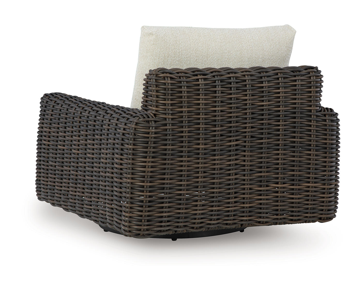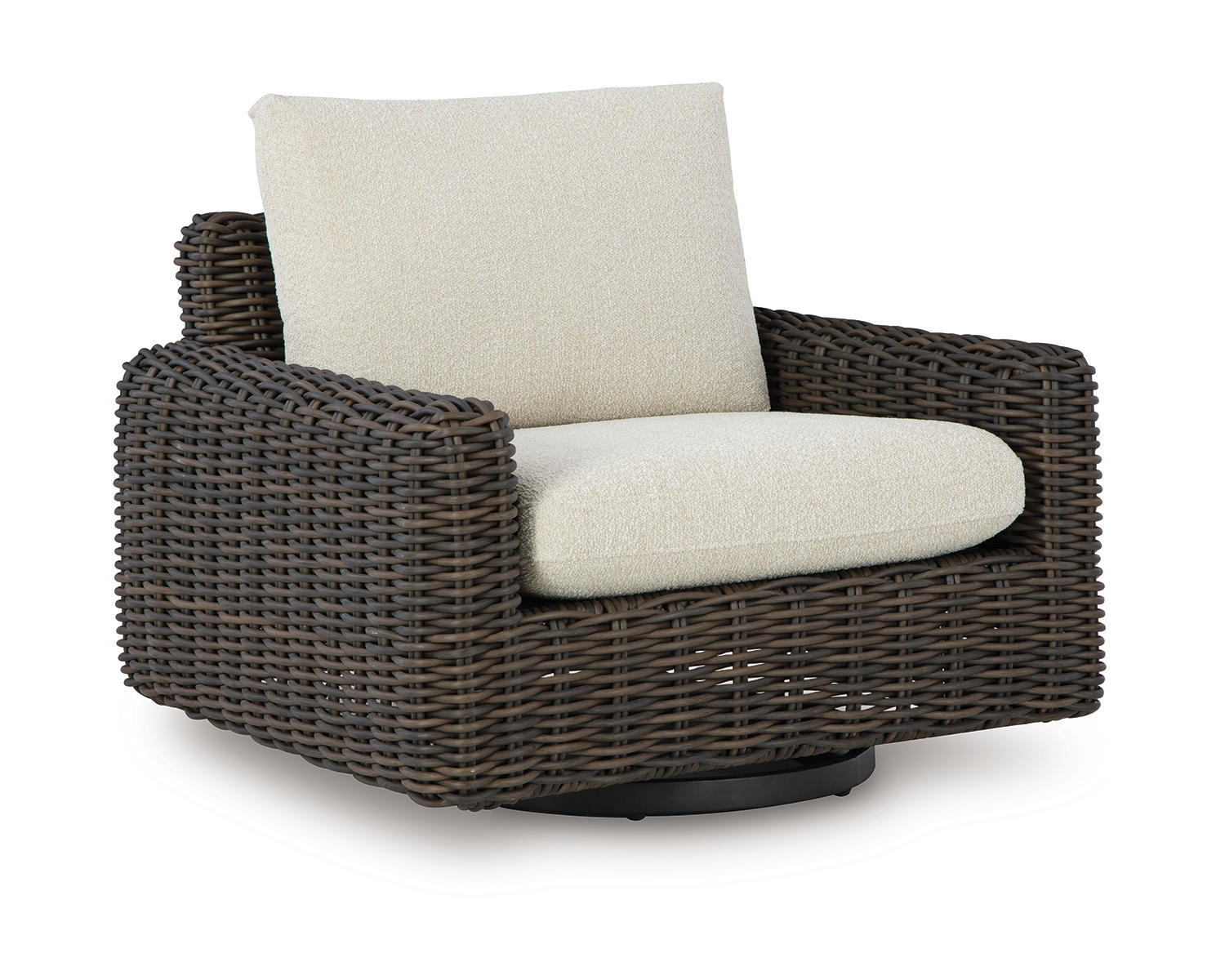 Add luxury, comfort and durability to alfresco fun. This outdoor swivel glider lounge chair captures the textural beauty of wicker while withstanding the elements, from rain to shine. With a UV-resistant design, the wonderfully low-maintenance Nuvella+™ fabric maintains its good looks over time. Deep, roomy seating completes the piece, offering ample space to sprawl out.