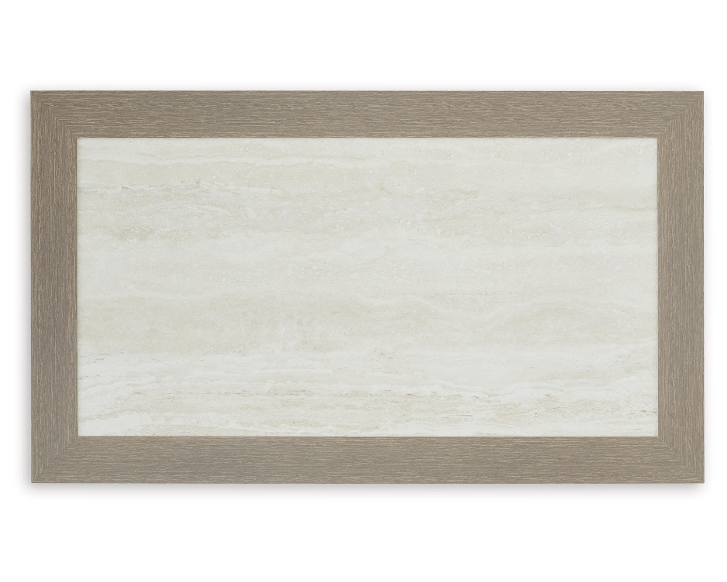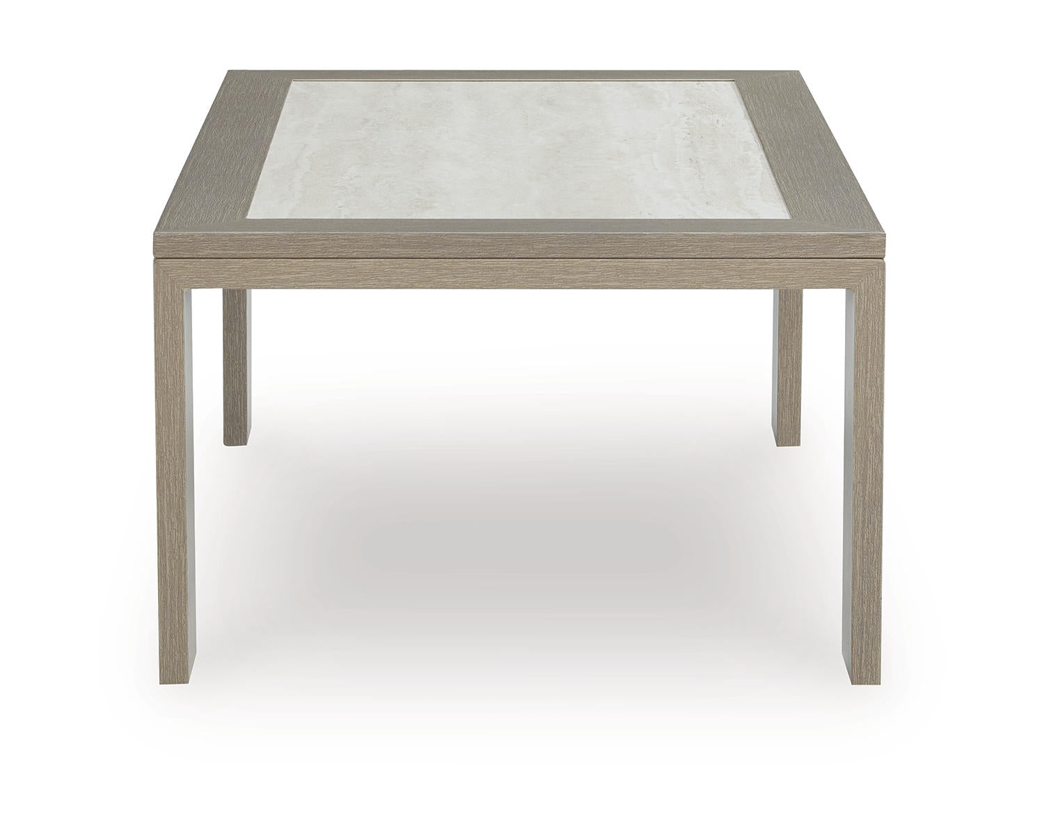 Millennium Collection. Wood-look aluminum. Sintered stone tile table tops. Nuvella+ high performance beige fabric. Assembly required.