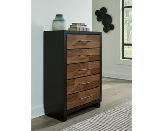 Experience the captivating allure of this chest of drawers, an effortless blend of casual and refined aesthetics. Its two-tone finish combines satin black with a rich brown wood tone for a modern, relaxed vibe that you'll love waking up to. Perfectly suited for your contemporary home, this chest has plenty of drawer space to tuck away your wardrobe and spare bed linens.