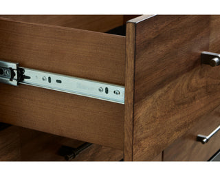 Casual lifestyle design. Made with hardwood solids, butcher block Mango wood veneer and MDF substrates. Finished in a trend-right two-tone finish featuring a warm satin black body with contrasting rich brown wood tone. Cases feature clean-lined contemporary design set on double plinth bases. Drawers have French/English construction with fully finished interiors and heavy duty ball-bearing side glides for smooth function.