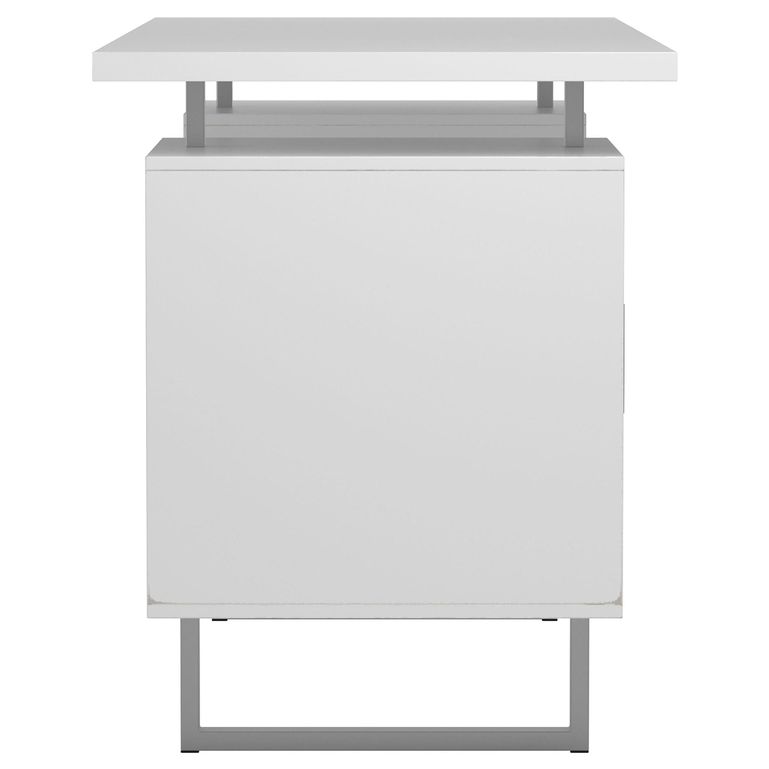 Chic and modern, this wooden writing desk creates a gorgeous focal point in any home office. Sleek lines of silver finished metal create a sturdy foundation for its stylish design. A rectangular, floating tabletop adds visual intrigue to its clean silhouette. A storage cabinet, drawer, and file cabinet keep office essentials organized with ease. Available in your choice of attractive colors, there's an elegant option to effortlessly match with your space.