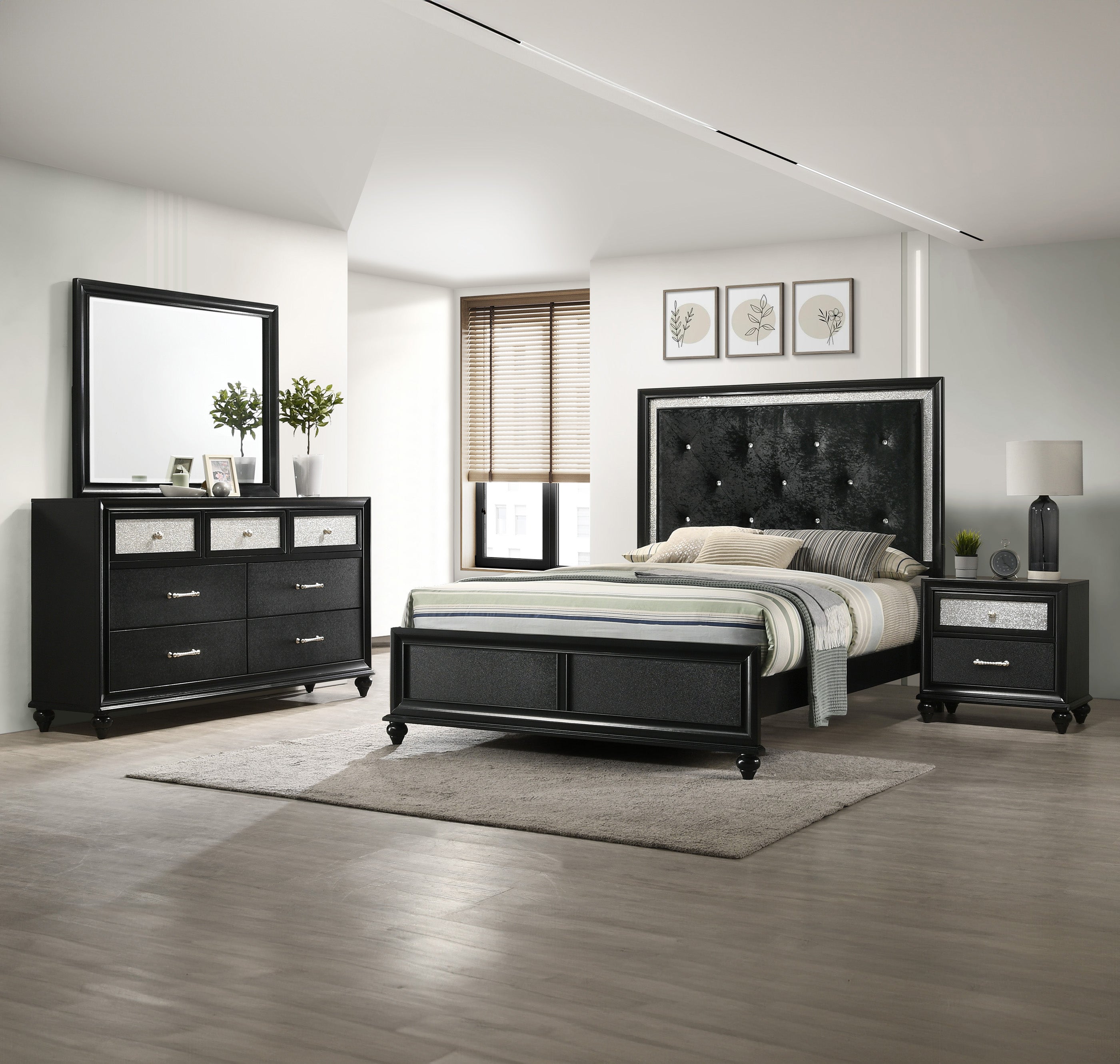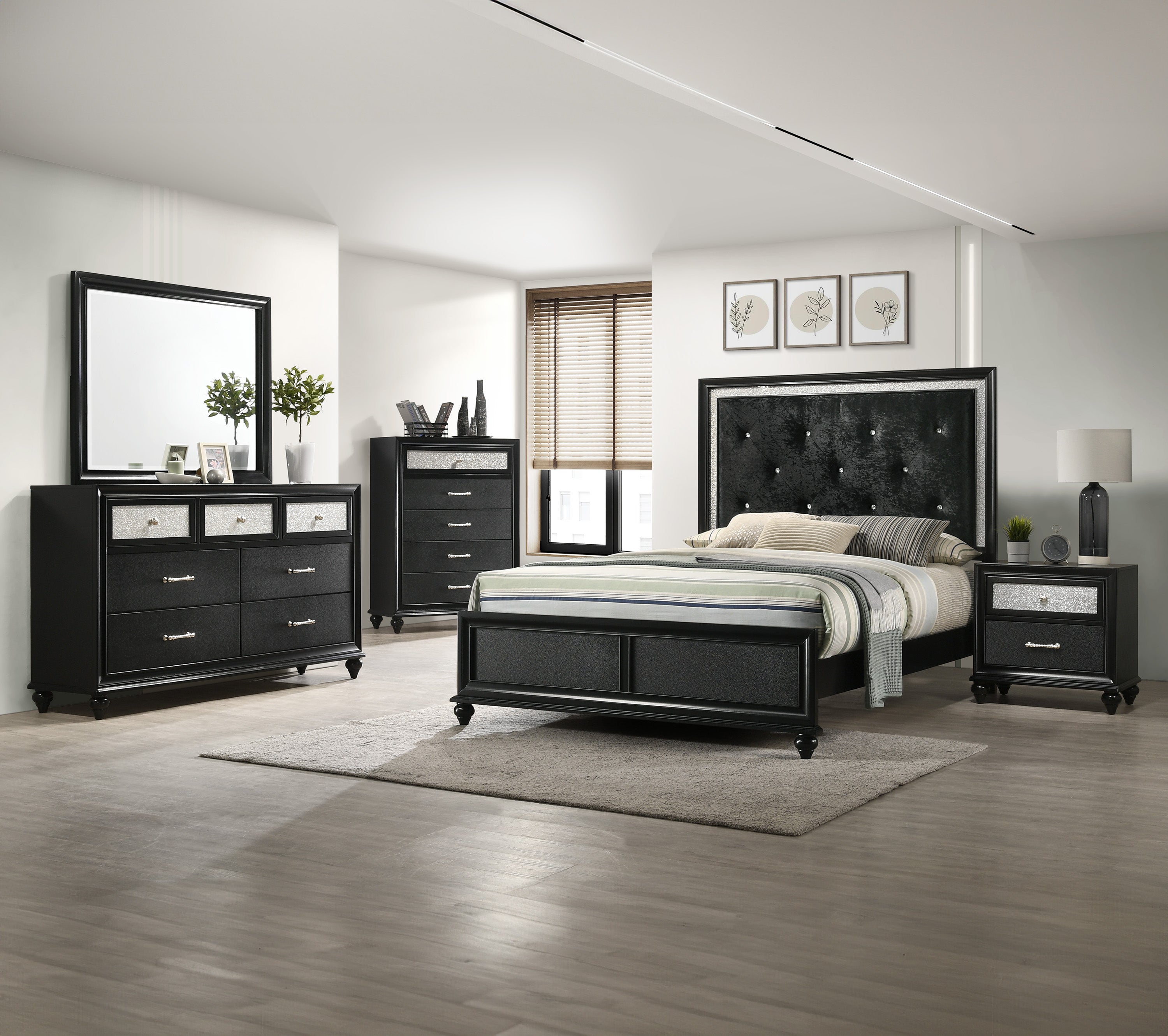 Unveil the epitome of elegance with this captivating bedroom ensemble, meticulously designed for those who covet glamor and grace in their private quarters. The bed, with its lustrous, tufted headboard, radiates luxury, while the shimmering accents frame your dreams in high-end allure. Accompanying storage pieces, including the sleek dresser, towering chest, and a charming nightstand, are adorned with sparkling pulls, enhancing the set's sophisticated sparkle.
