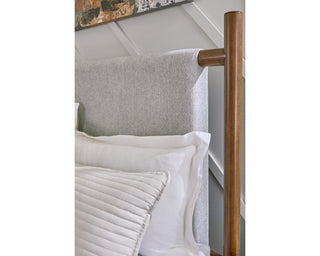 Casual contemporary design. Made with hardwood solids, Mango wood veneer and MDF substrates. Finished in a medium brown natural wood tone. Clean case designs sit on round tapered legs with thick front frames and overlay drawer fronts for added dimension. Drawers feature French/English dovetail construction, fully finished interiors and heavy duty ball-bearing side glides for durability and smooth function. B615-81/-82 stylized poster bed with rounded solid wood frames and a sling style headboard cushion covered with a soft gray fabric. Two drawer nightstand includes a 110V power supply with USB-A and USB-C charging ports.