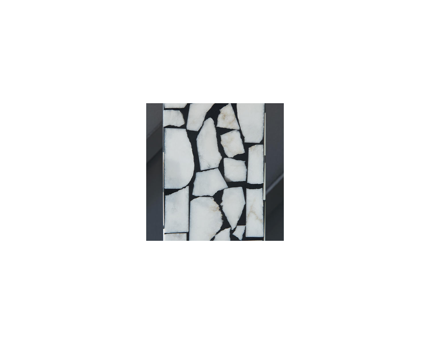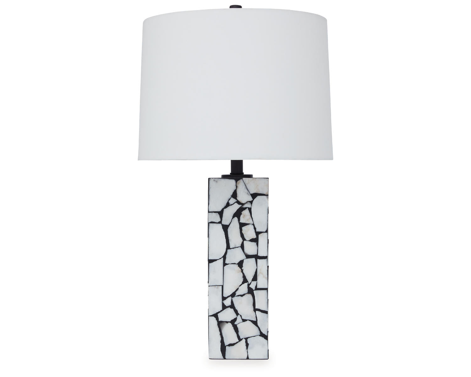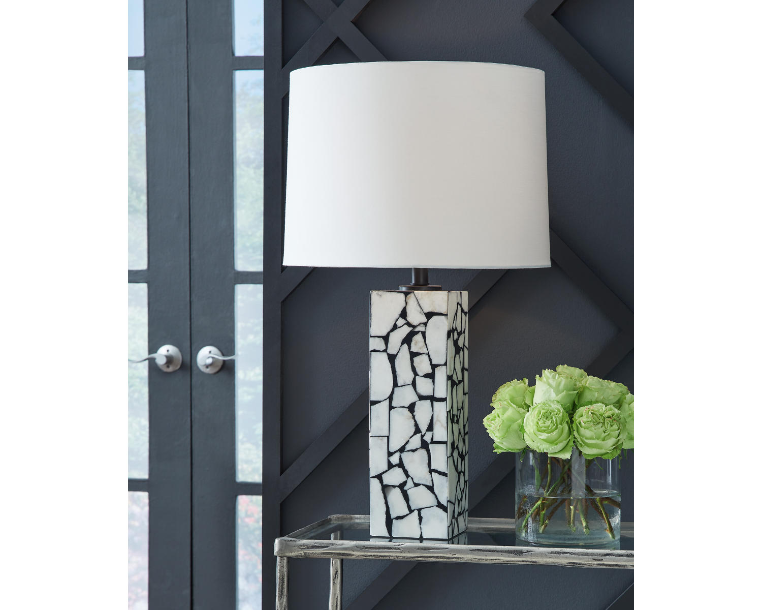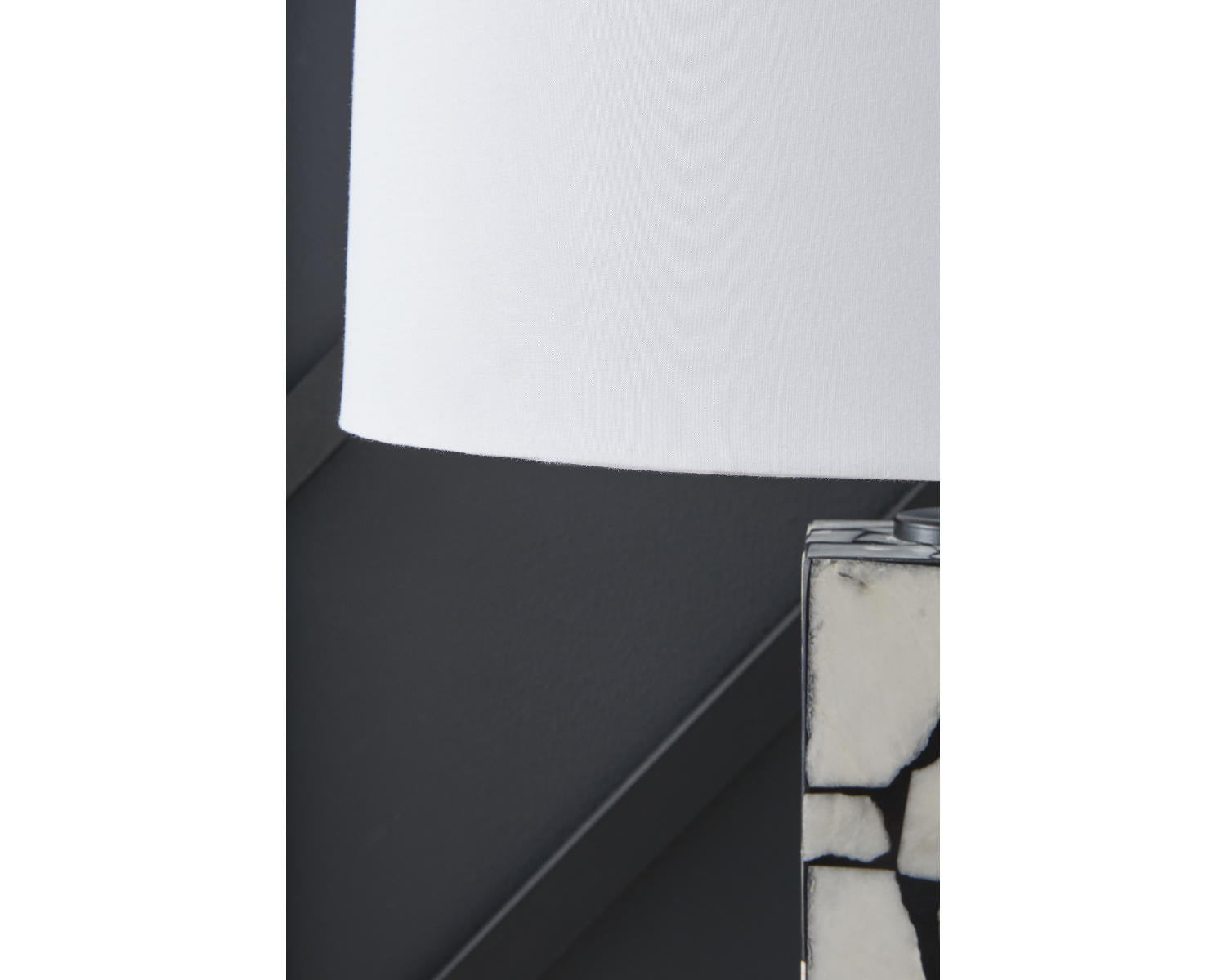 This exquisite table lamp is artfully adorned, with a mosaic pattern of white marble playing beautifully against a black background. Complemented by a modified drum shade for a sophisticated sensibility, the lamp casts an elegant glow in the entryway or living area.