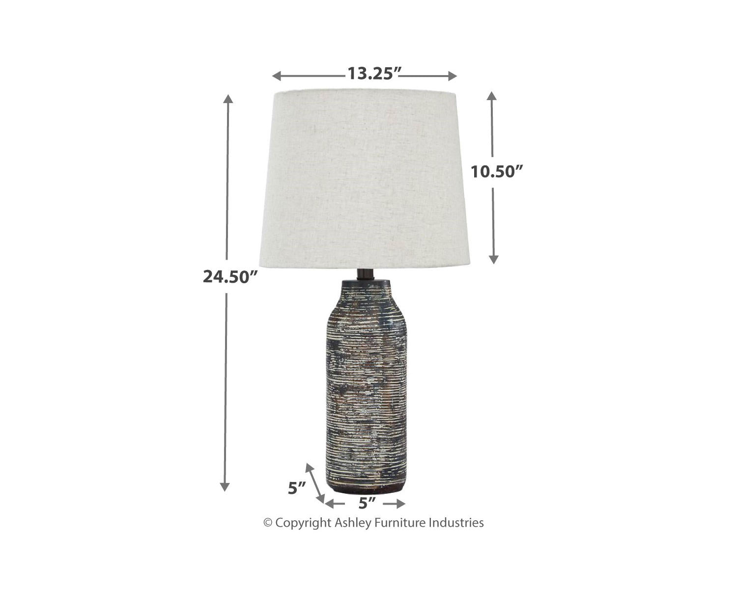 Distressed Black and white finished table lamp. Modified drum hardback shade. 3-way switch. (1) E26 socket, type A bulb recommended - 150 watts max or 25 watts max CFL. Due to the finishing process of this product, some variations may occur.