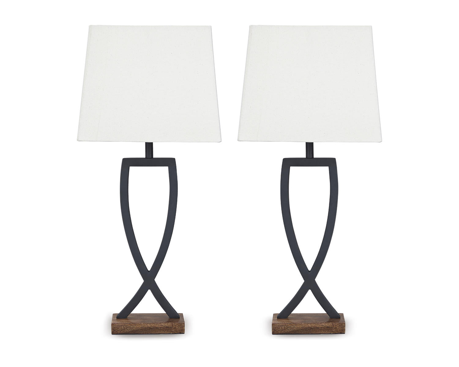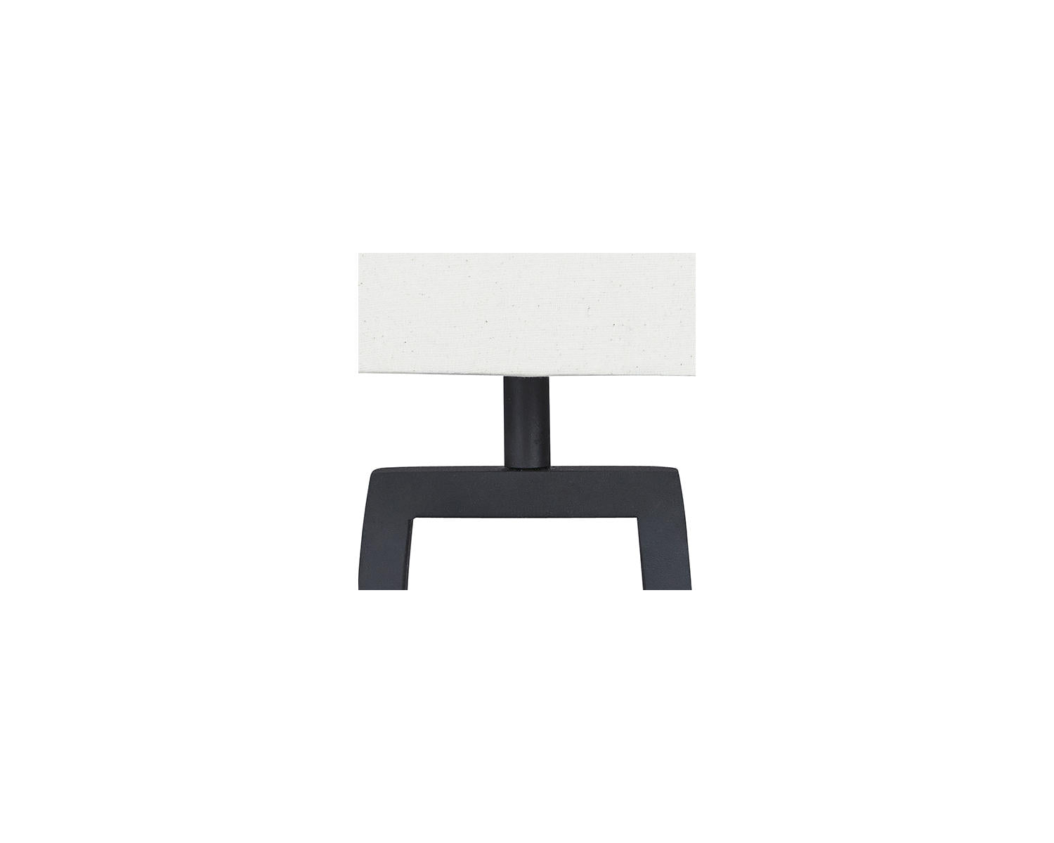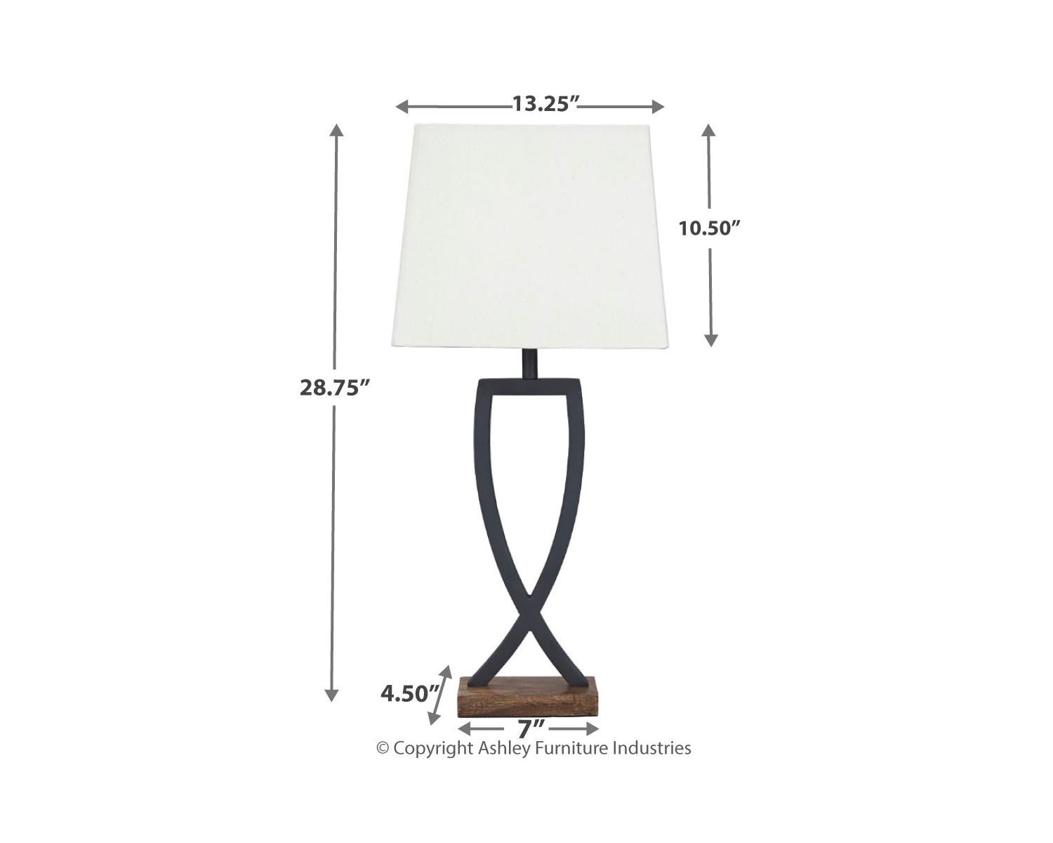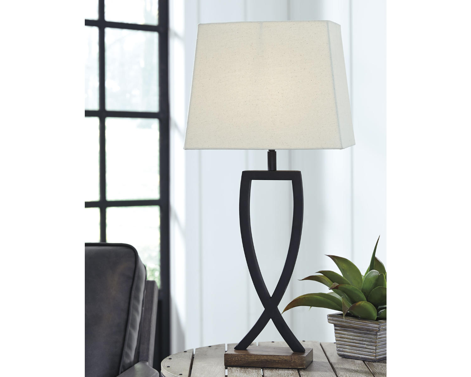 This table lamp is an enticing merge of mixed materials. Textured black finished metal stands poised atop a block of warm brown wood. Open design is right at home among casual decor.