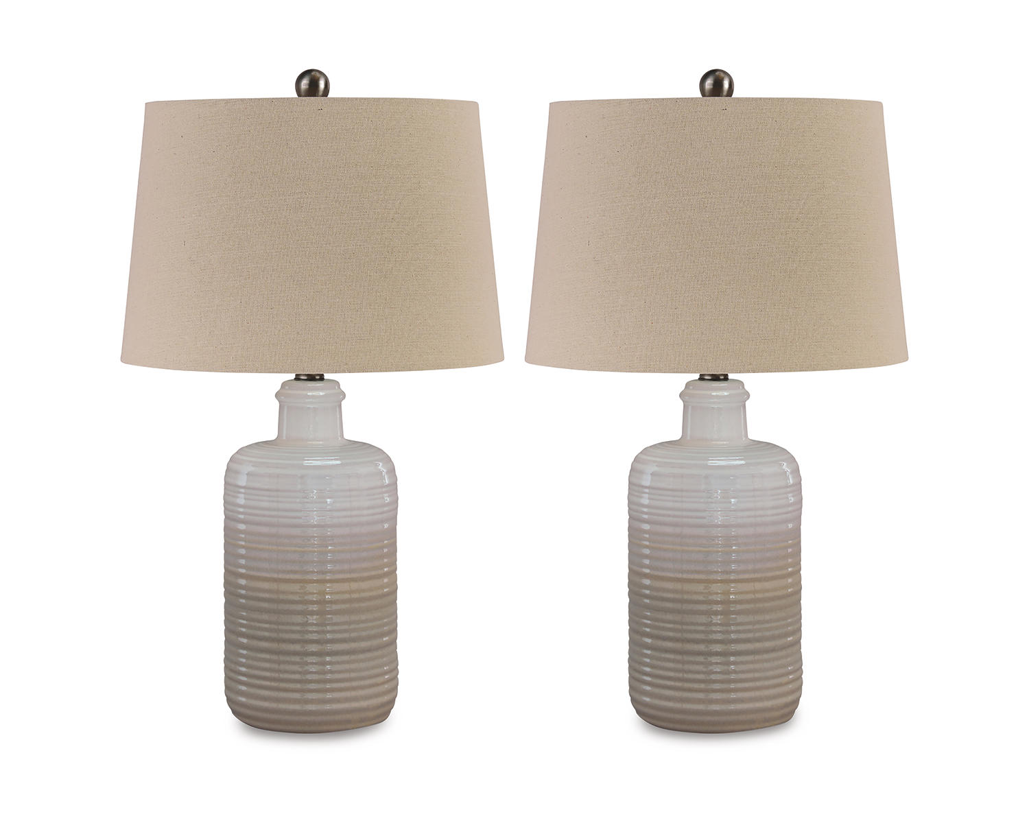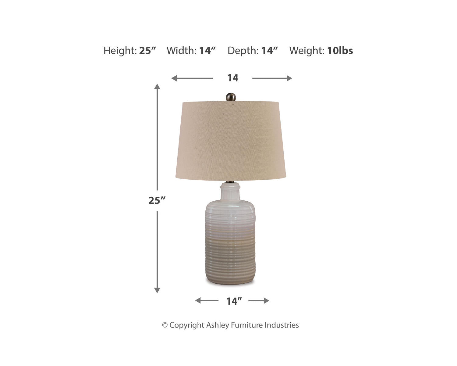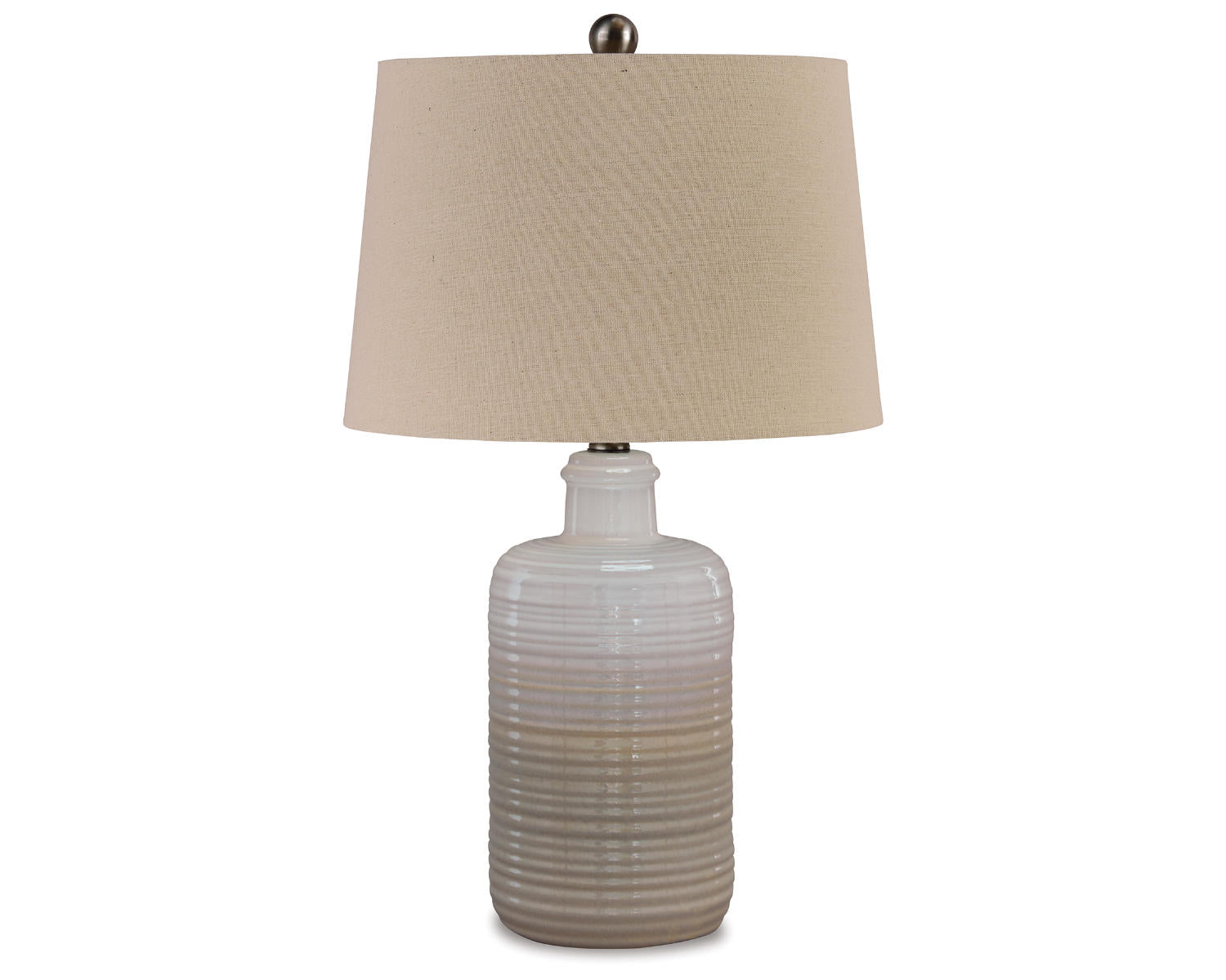 White and taupe glazed ceramic table lamp. Modified drum hardback shade. 3-way switch. (1) E26 socket, type A bulb recommended - 100 watts max or 23 watts max CFL.