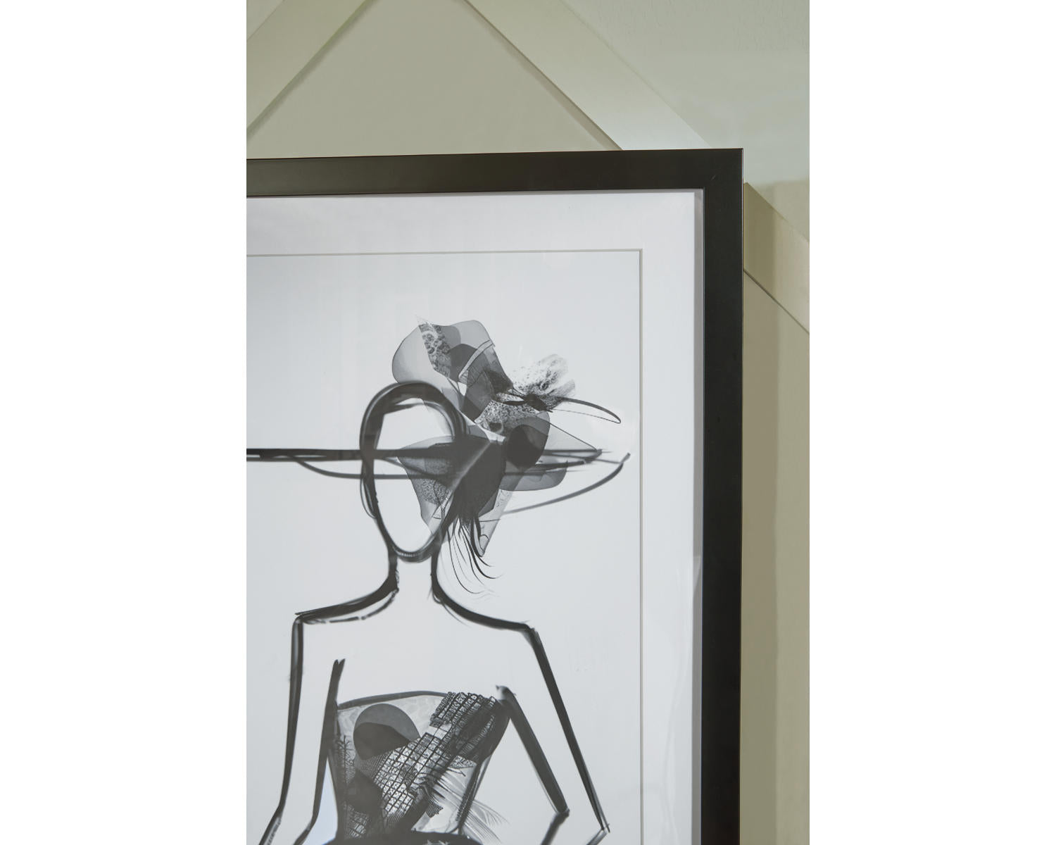 Set of three. Fashion prints in black and white. Framed print. Acrylic front with mat. D-ring bracket for hanging. Vertical hanging only.