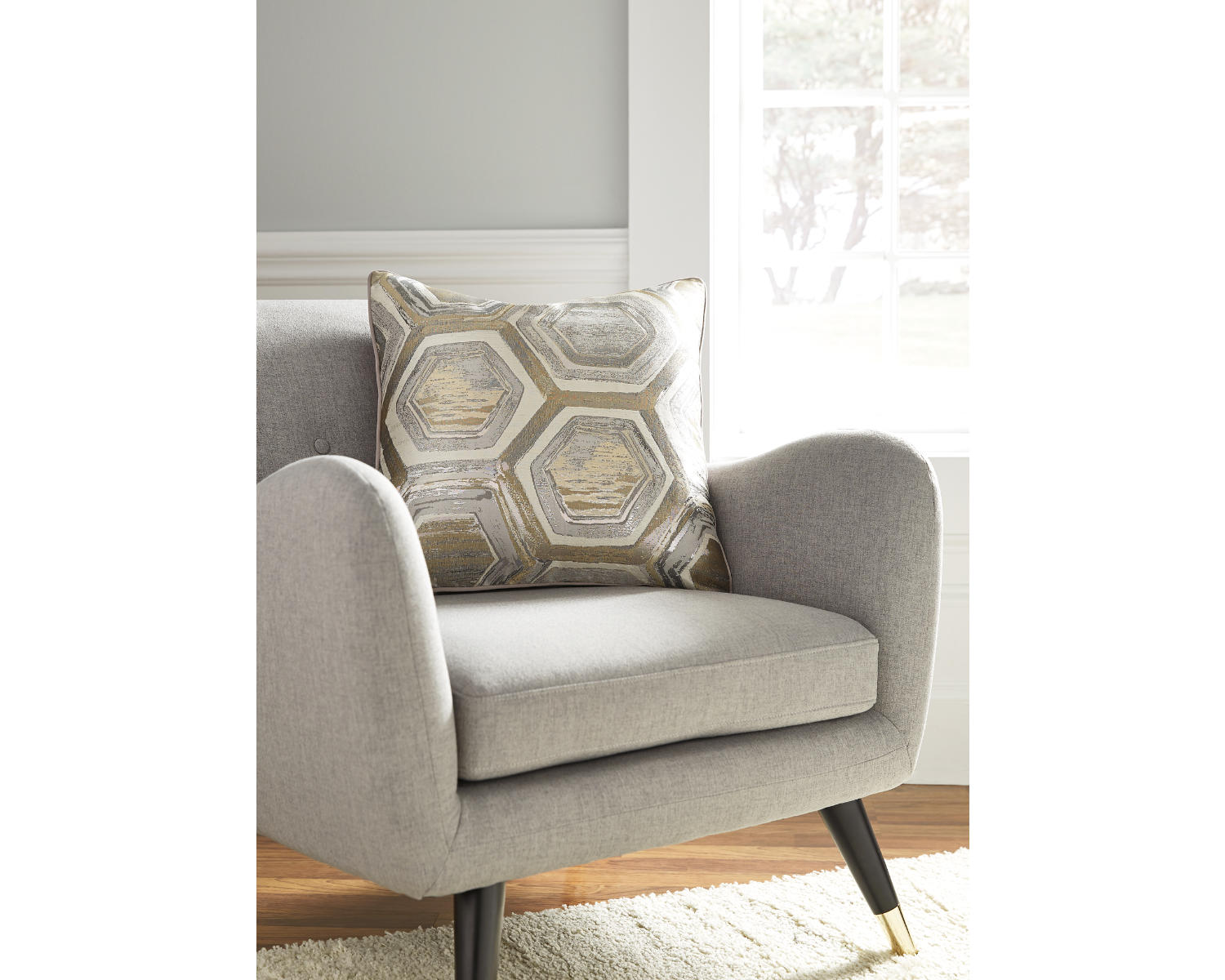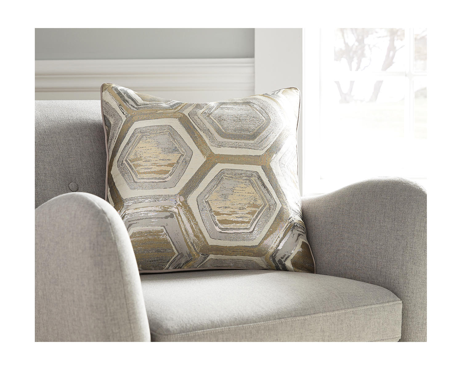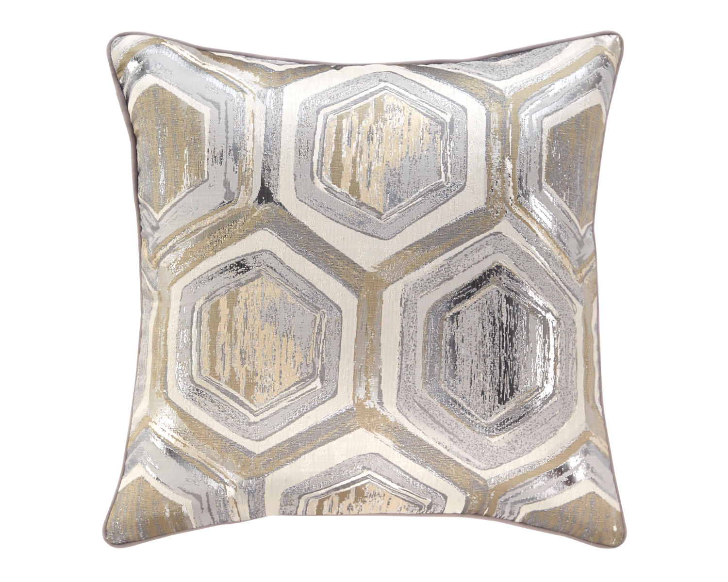 Jacquard with hexagon design in gray, champagne, ivory and metallic silver. Solid reverse in champagne. Polyester cover. Zipper closure. Fiber filled. Machine washable cover.