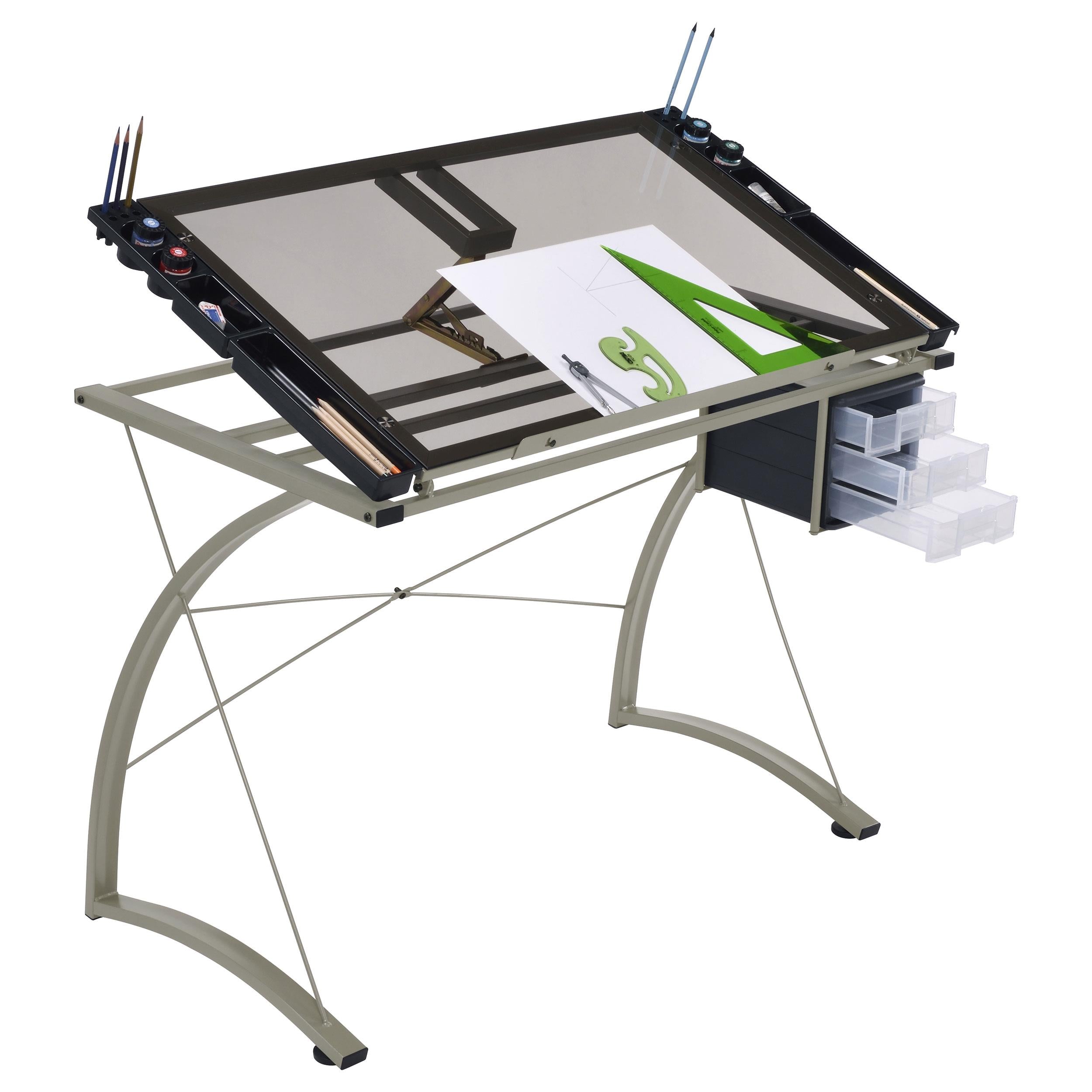 Contemporary attitude shines positive light on this fabulous drafting desk. With curves and linear elements, it creates an enticing look. Enjoy luscious champagne finish steel and a smoke tempered glass top. Find space to stash essentials in a pencil ledge, three drawers, and a variety of storage compartments. This elegant, versatile desk brings a light, airy flavor to a home or business office.