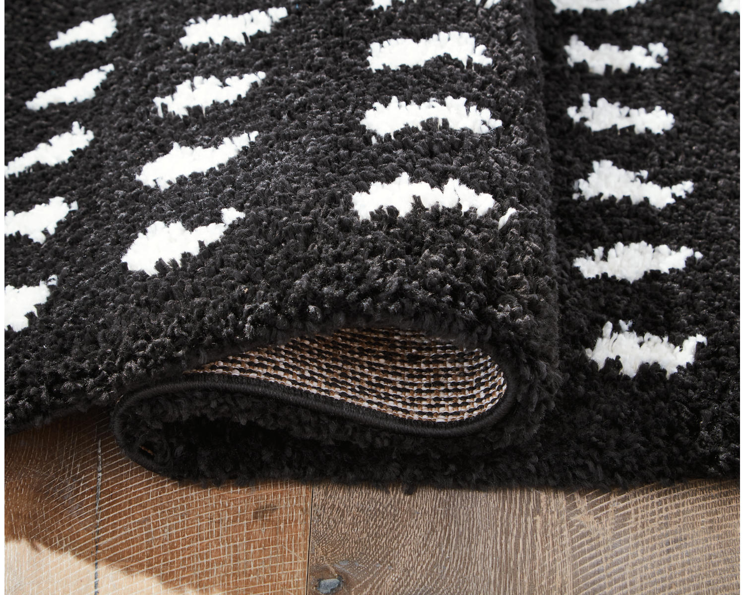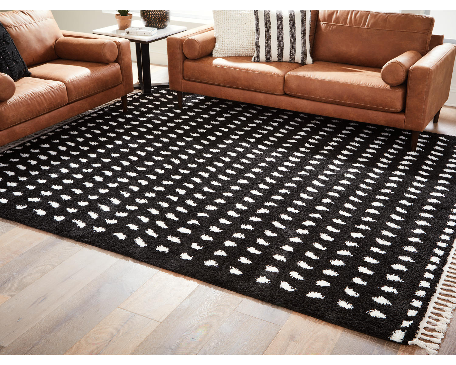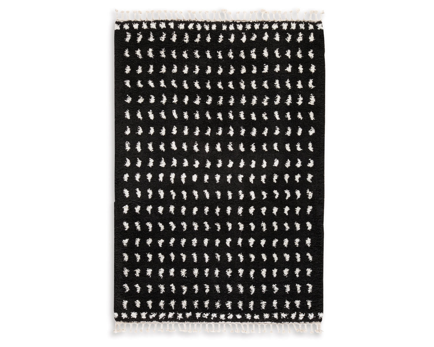 Machine woven shag, modern dot design in black and white. 30mm pile. 3" braided tassel edge. Heat set polypropylene, backed with jute. Spot clean only. Rug pad recommended.