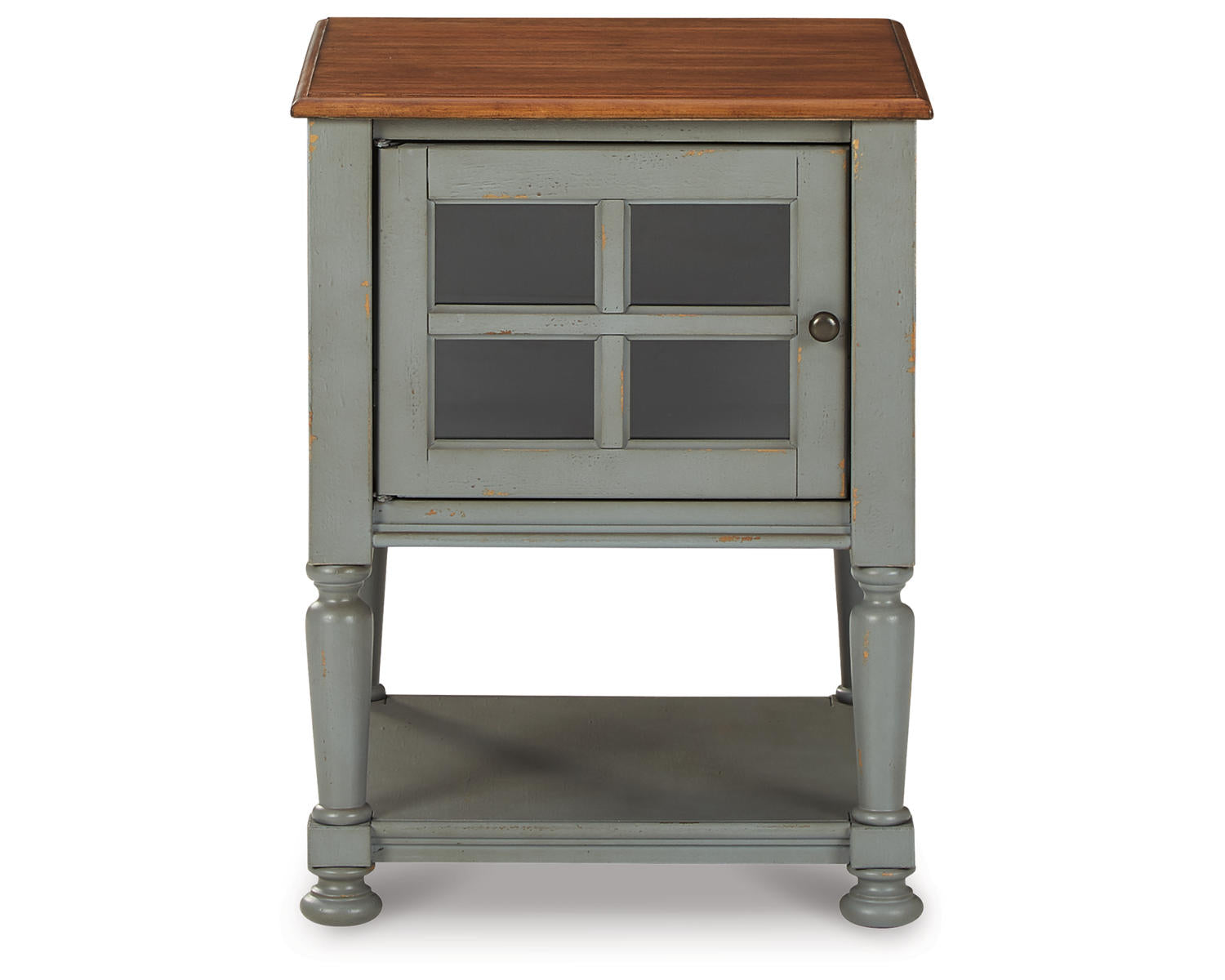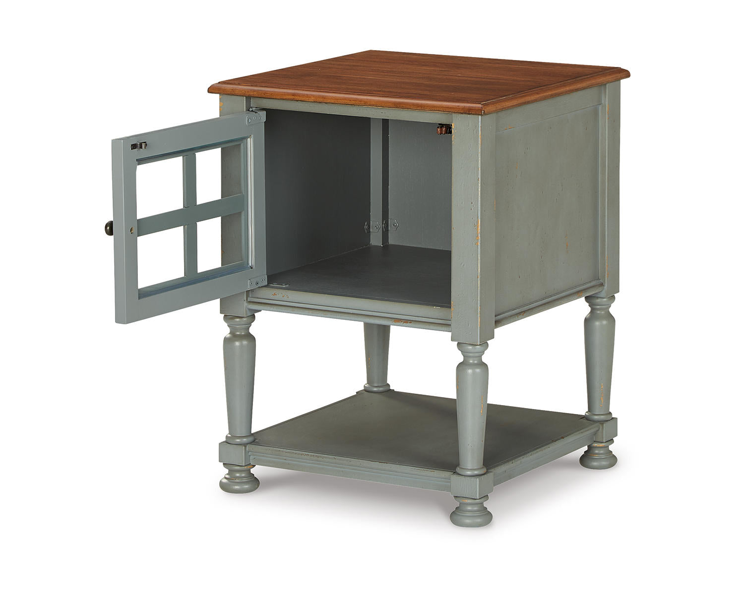 Accent cabinet. Constructed of veneers, solid and engineered woods in antique gray and brown finishes. Lattice door front with clear inset glass. Antique pewter finished metal door pull. 1 door and 1 shelf.