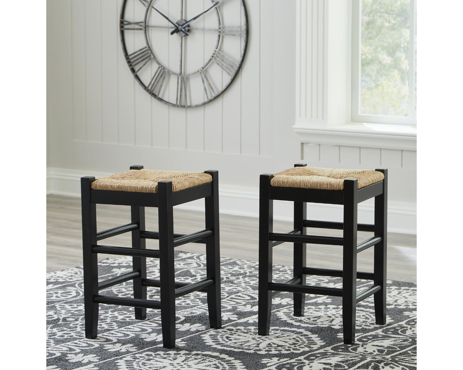 Casual farmhouse styling. Made with solid rubber wood frame with woven synthetic wicker seats. Square non-swivel stools feature 8 solid wood stretchers. Round swivel seat stools feature a round metal foot rest. D508-124/-130 is painted with a clean black finish. D508-224/-230 is painted with a vintage white rubbed-through finish. D508-324/-330 is painted with an antique blue rubbed-through finish.