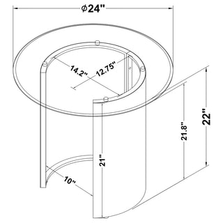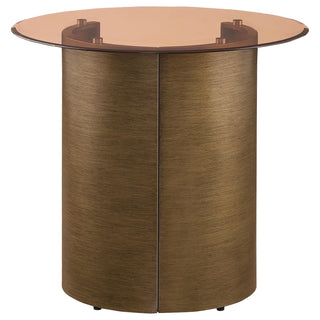 Embodying the warmth of a golden sunset, this round end table features a tawny tempered glass top, offering both sophistication and durability. The cylindrical base, crafted with a hand-brushed bronze finish, curves into an open design that allows light to filter through, casting a dynamic interplay of shadows. This piece not only serves as a functional end table but also adds a gentle opulence to the room. The elegant combination of glass and brushed bronze reflects timeless artistry and design.
