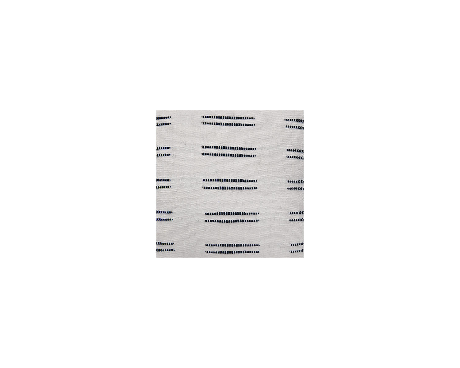 Dobby woven rib stripe design in black and white with black tassels. Solid reverse in white. Knife edge construction. Cotton cover. Zipper closure. Fiber filled. Spot clean only.