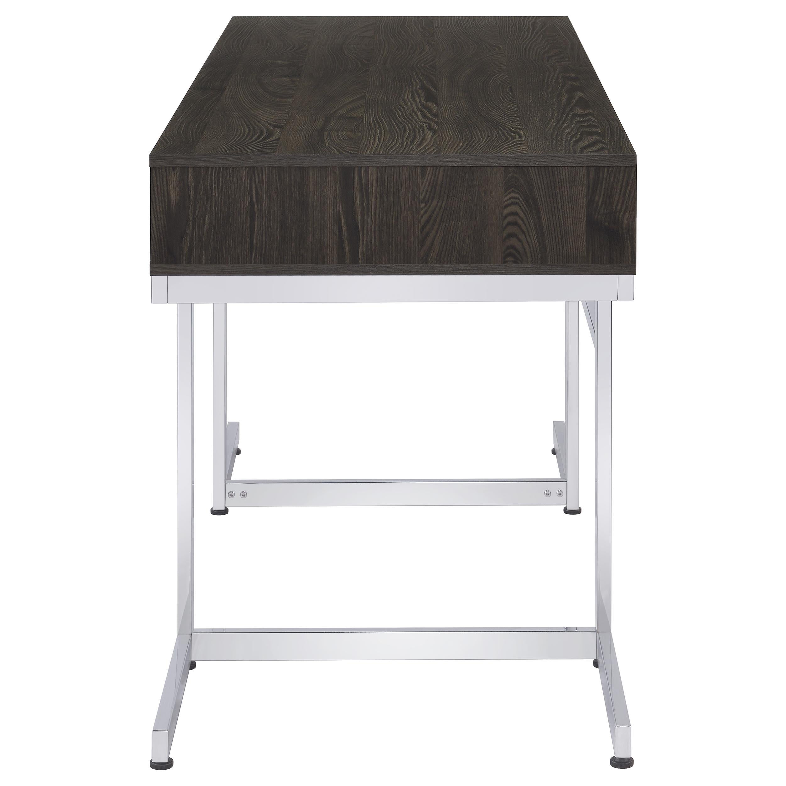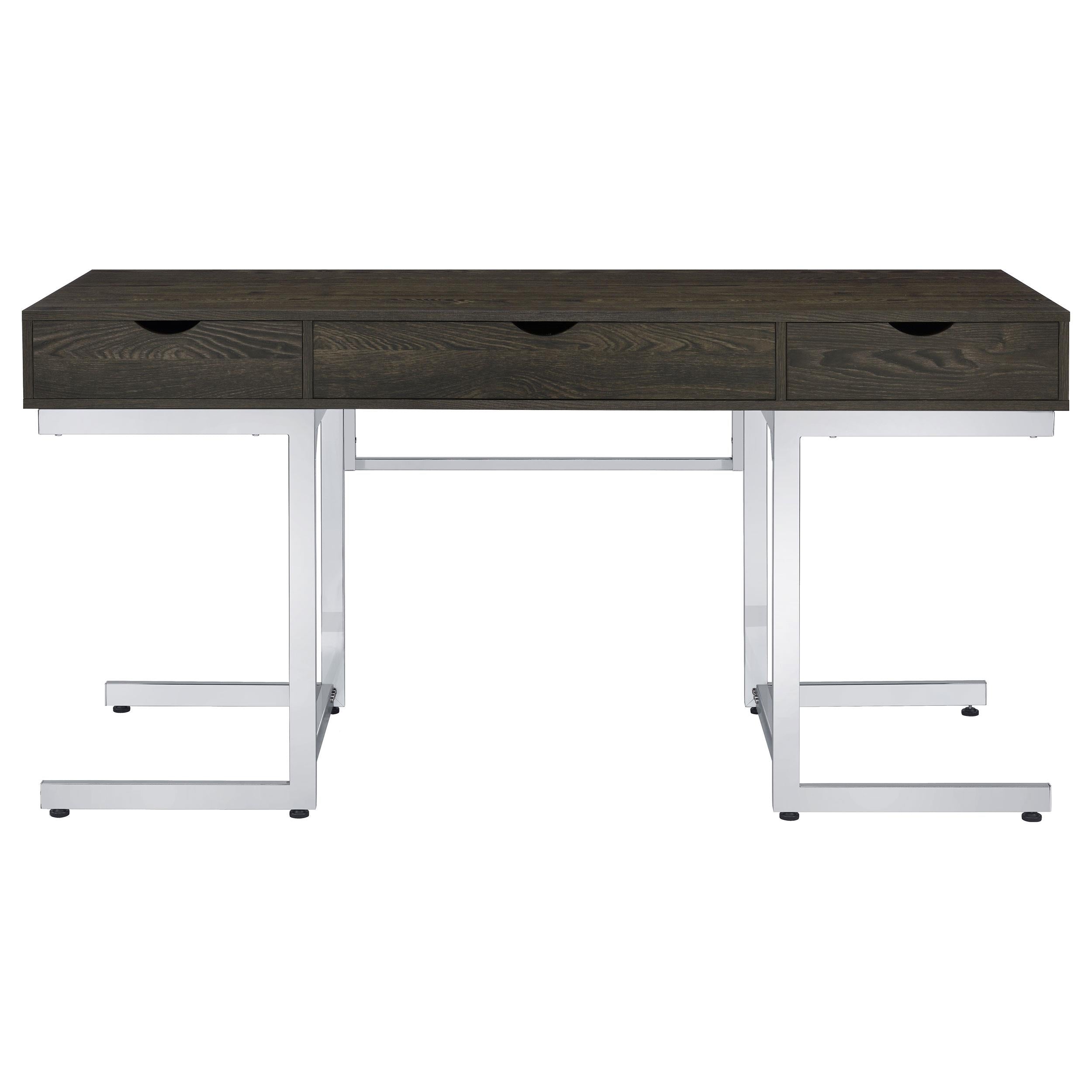 Created with a dark oak finish, this contemporary writing desk offers a bold statement piece to any room. A rectangle tabletop with three drawers appears to float, supported by a trestle-inspired steel frame. The steel frame also features a chrome electroplated finish that offers a lustrous gleam that adds a striking contrast. Each of the three drawers features a flush front panel free of hardware and are attached to full extension glides for a smooth operation. Perfect for a transitional or industrial style home office, this writing desk lends a chic, glamorous touch.