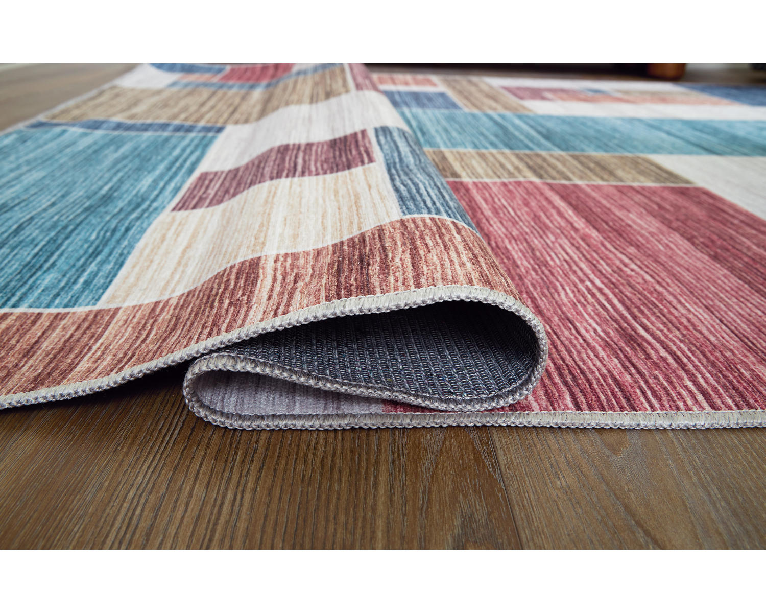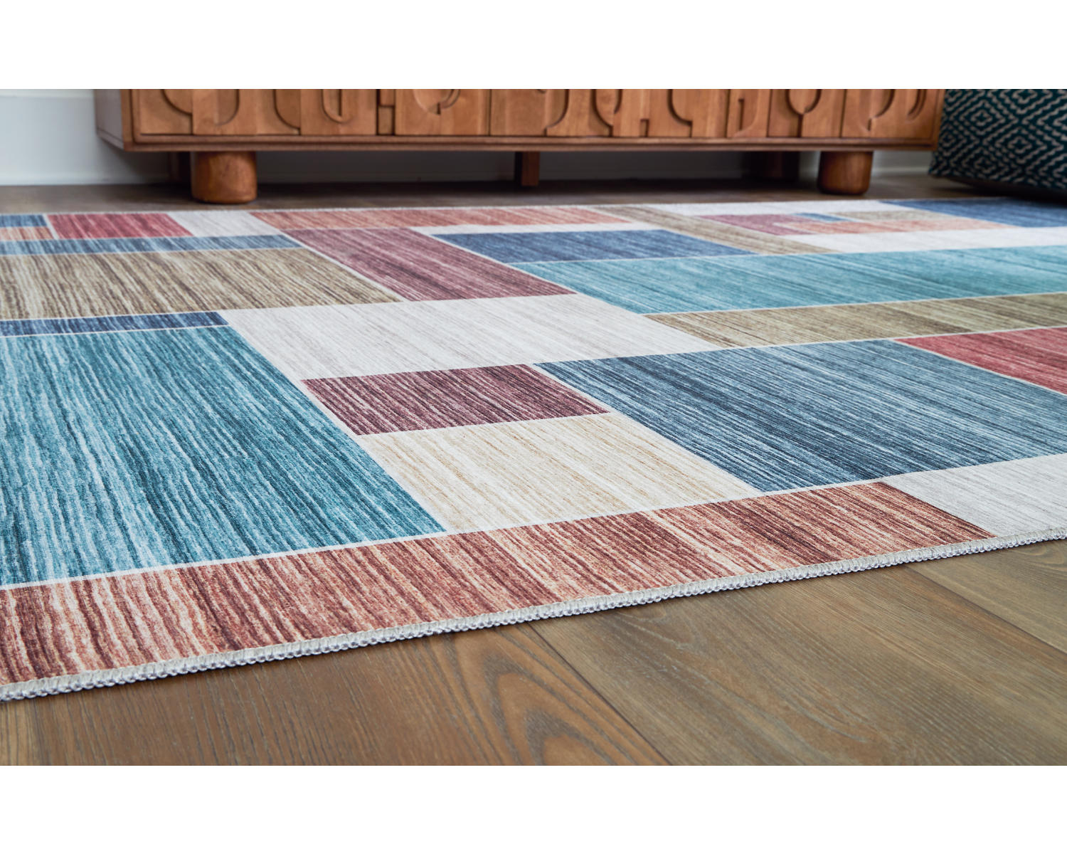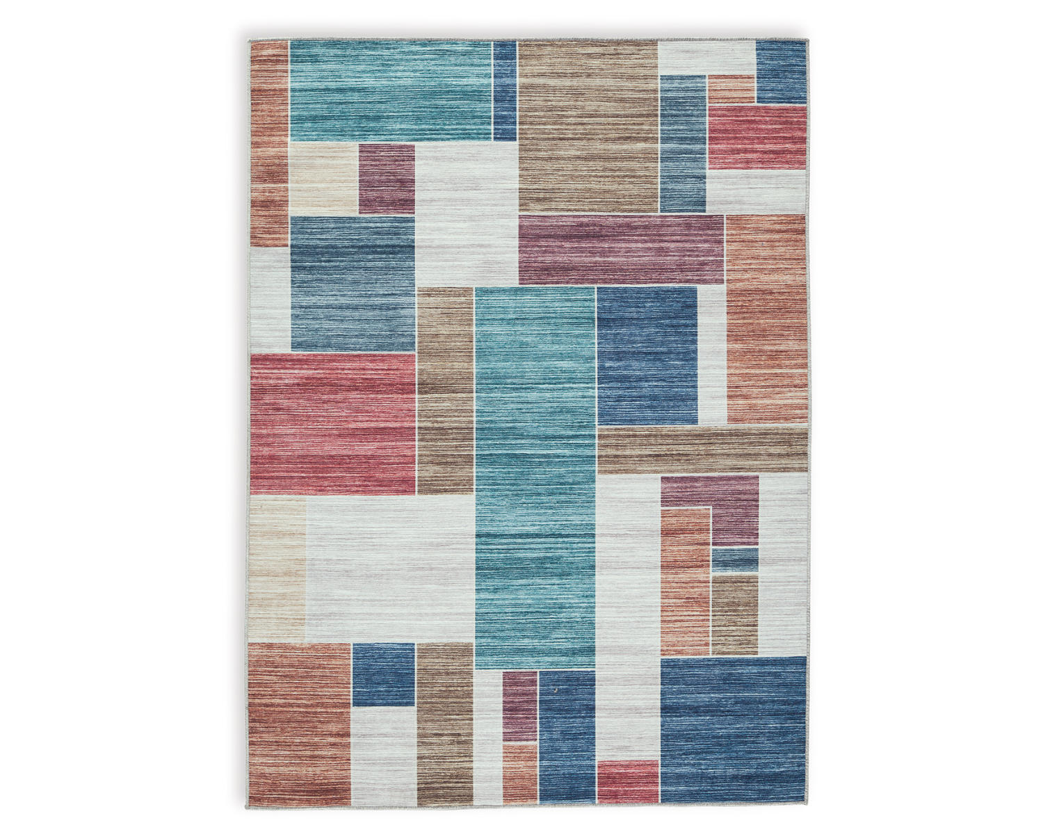 Machine woven, geometric design in shades of beige, teal, blue, green, orange and rust. 6mm pile. Polyester/cotton blend, backed with cotton/EVA blend. Machine washable. Rug pad recommended.