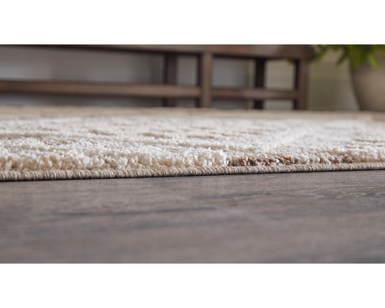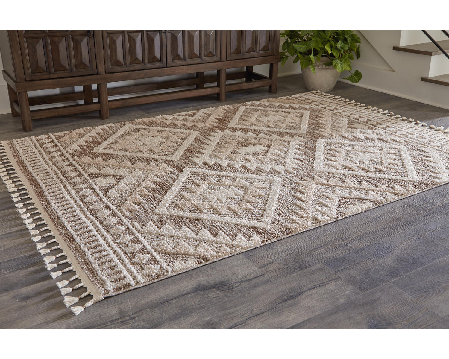 Machine woven high-low, diamond design in tan and cream. 10mm pile. 3" braided tassel edge. Polyester shrink yarn/polypropylene frieze blend, backed with jute. Spot clean only. Rug pad recommended.