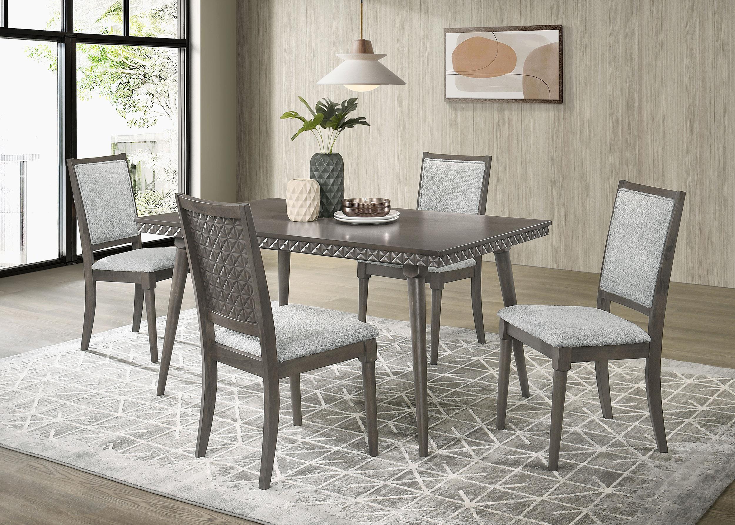 Introduce modern elegance to your dining room with this stunning 59-inch dining table. Its distinctive design features intricate detailing along the apron, adding a textural contrast to the smooth tabletop. Constructed with a blend of solid wood, engineered wood, embossed mdf, and okume veneer, this table ensures both durability and style. The dark brown finish enhances its sleek, sophisticated appearance, making it a focal point in any dining space. Tapered legs add a mid-century touch while maintaining a contemporary appeal, perfect for modern or transitional homes.