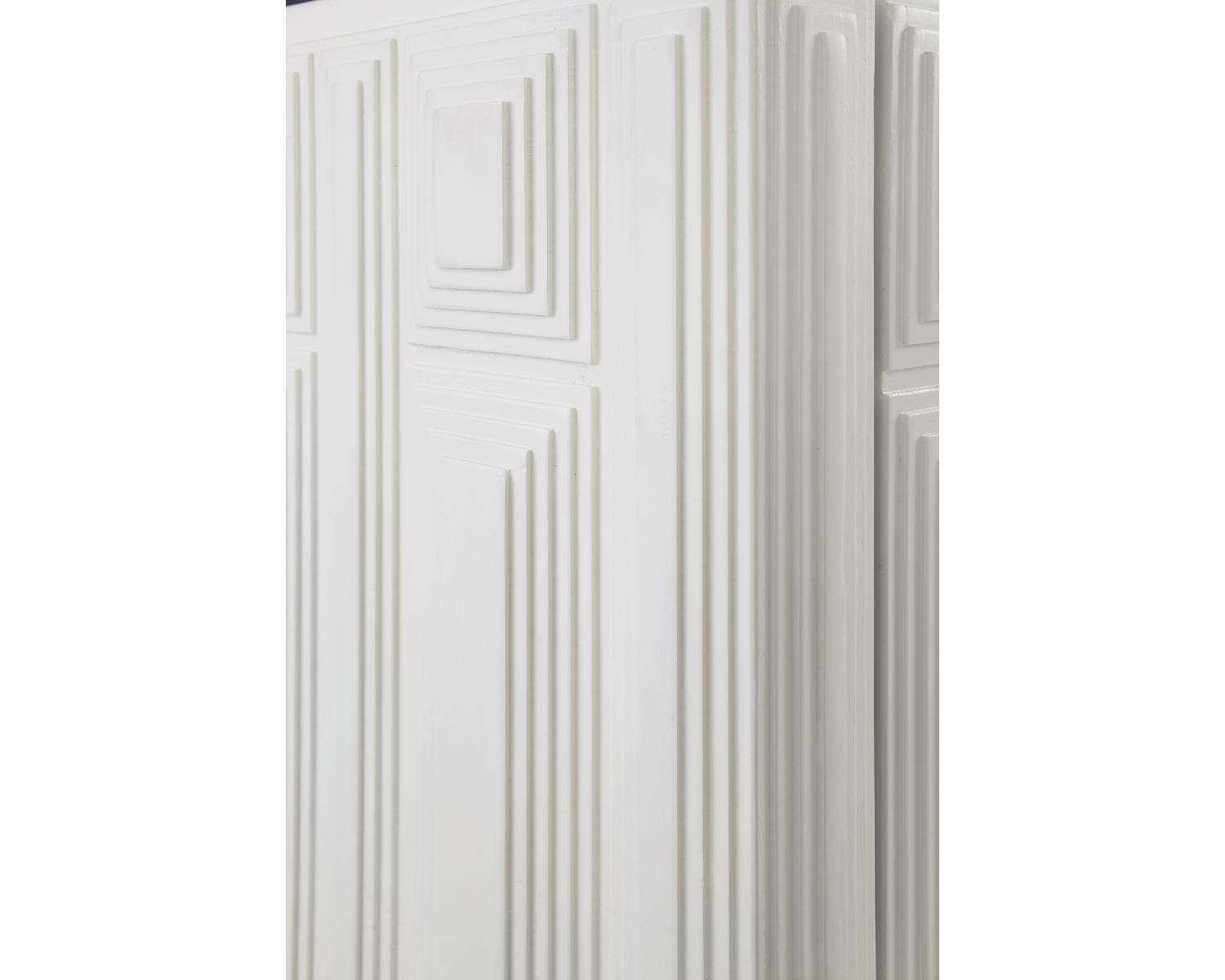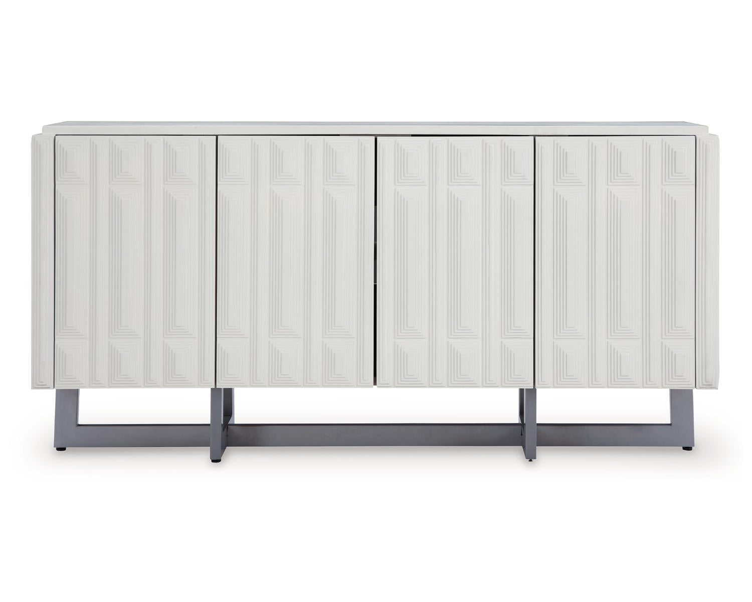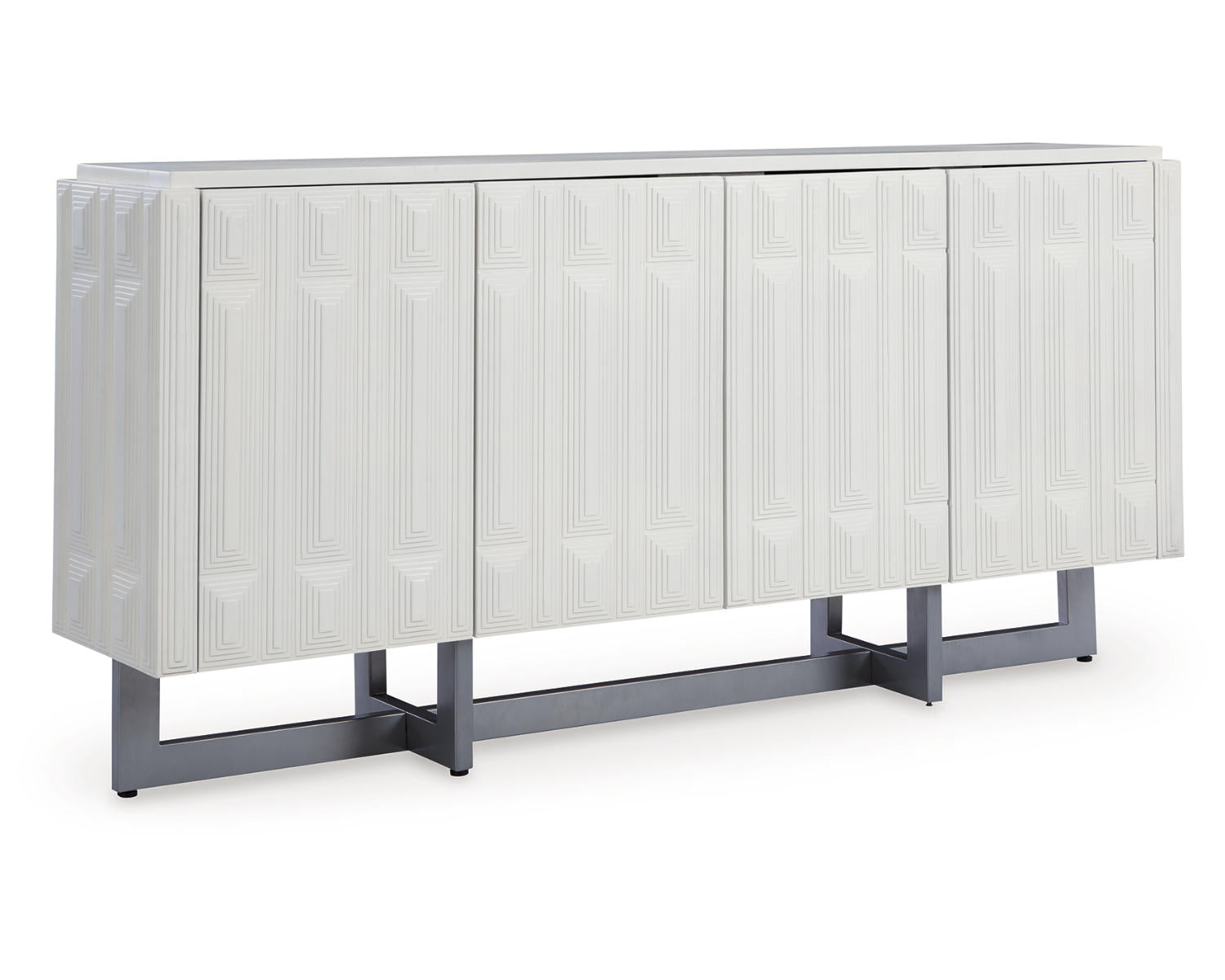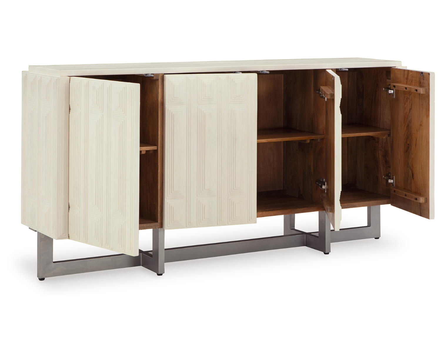 Keep things contemporary cool with the Ornawel accent cabinet. The step pattern on the door fronts lends an appealing geometric touch, with a lightly distressed white finish enriching the design. Touch latch doors open to reveal two shelves for all your storage needs. What a high-style statement.